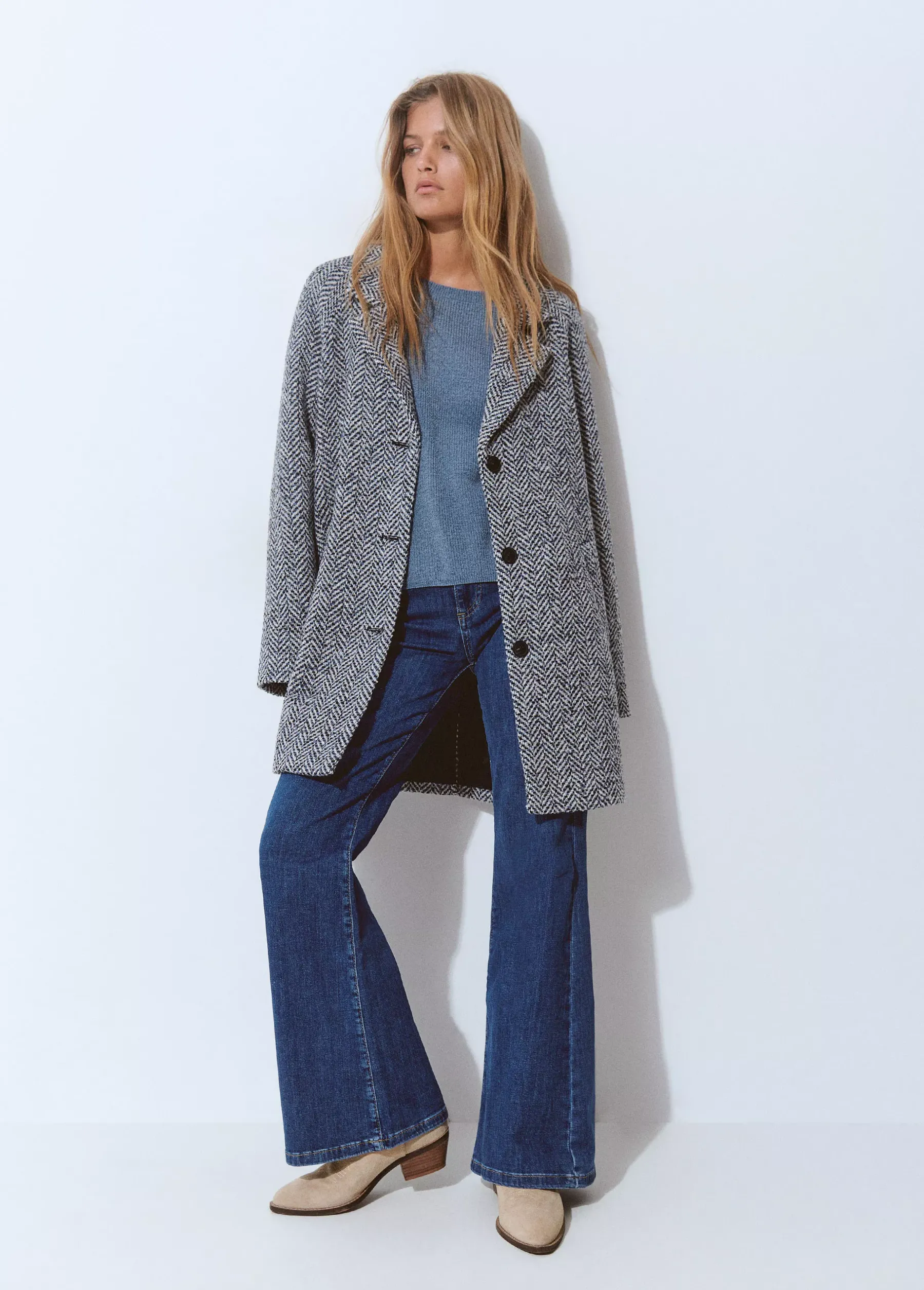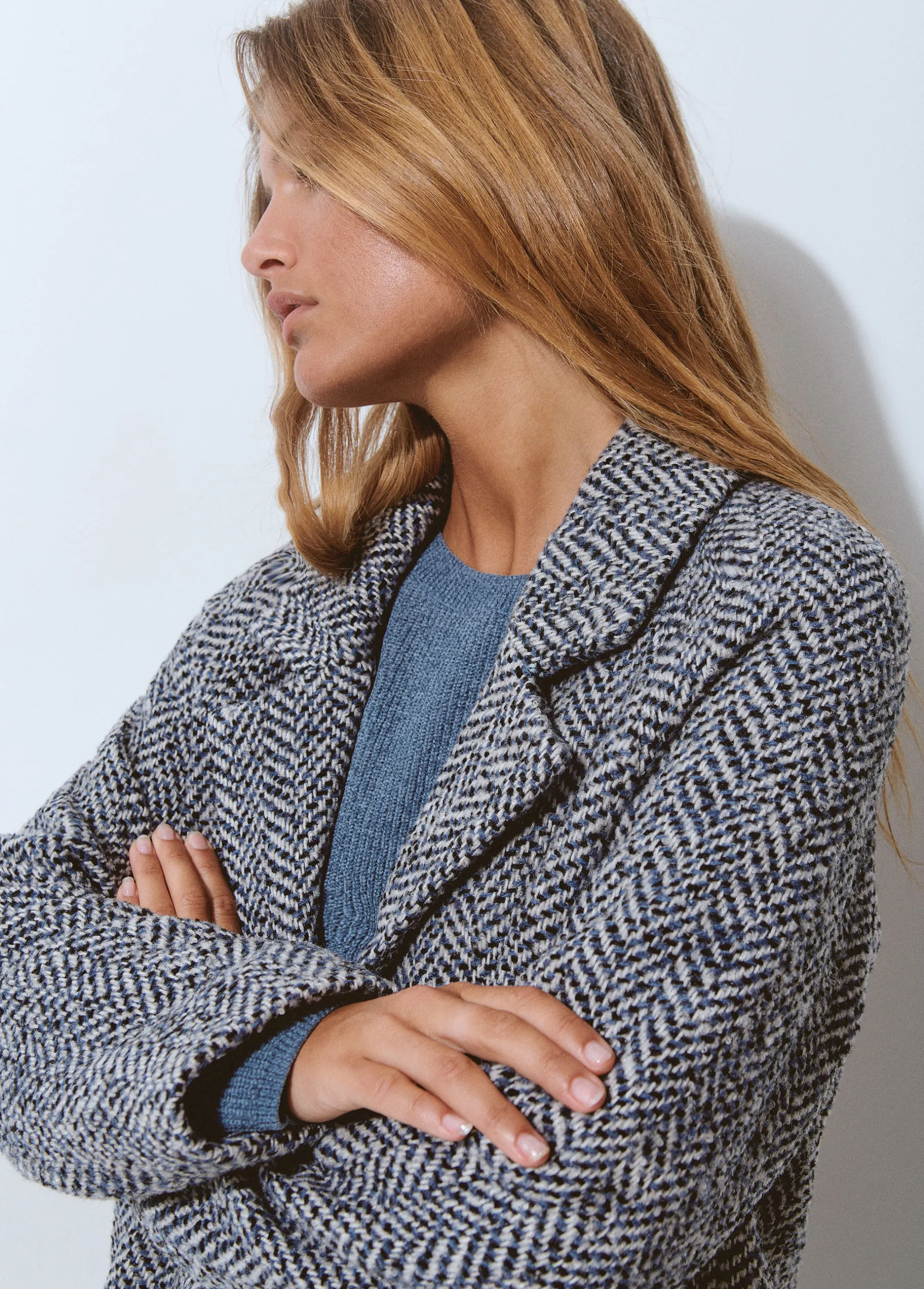 Abrigo de espiga con solapas. Cierre mediante botones en la parte frontal.