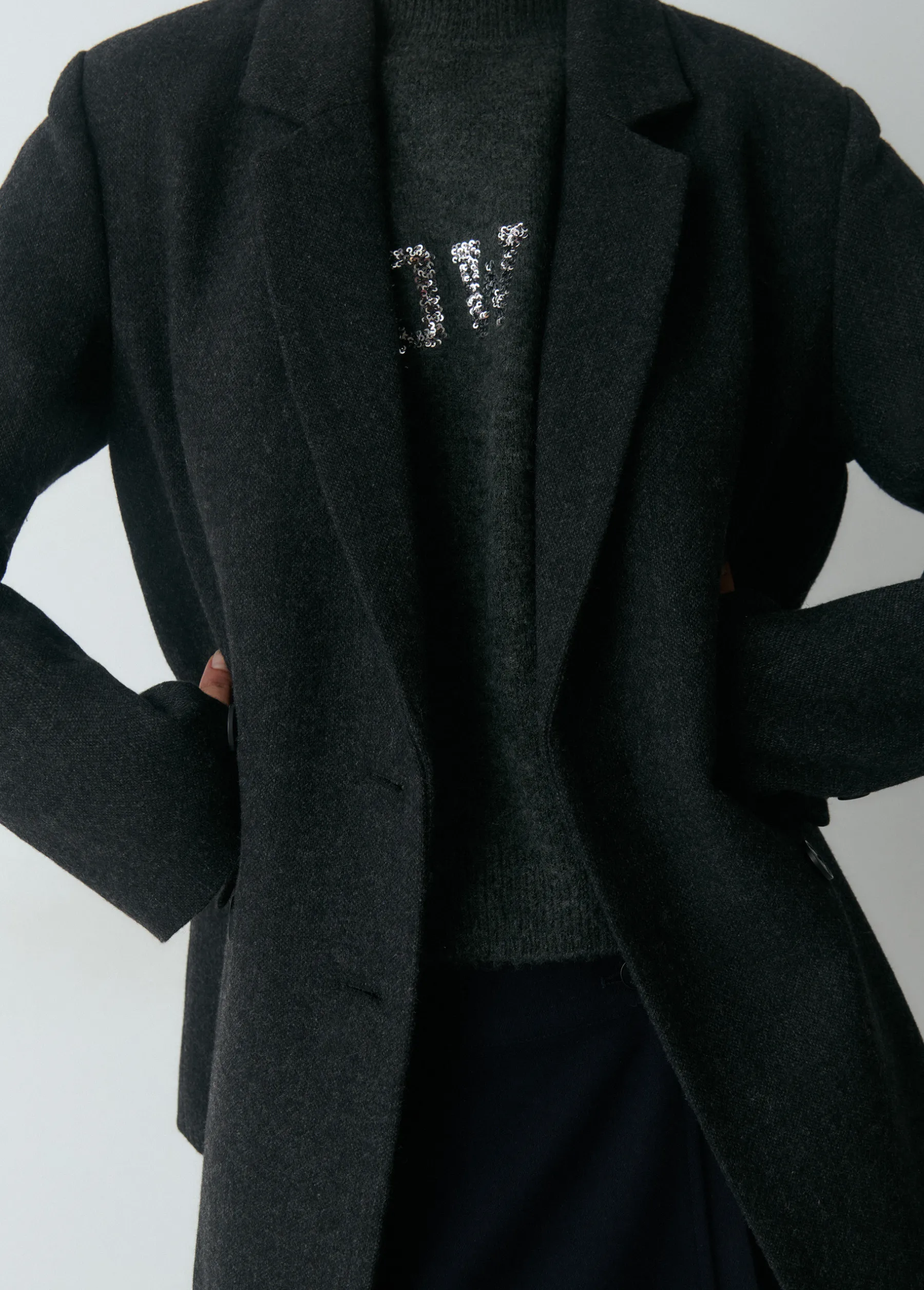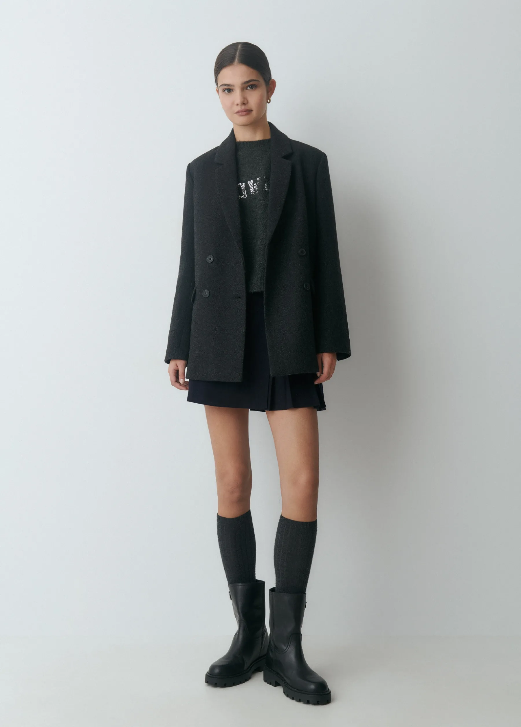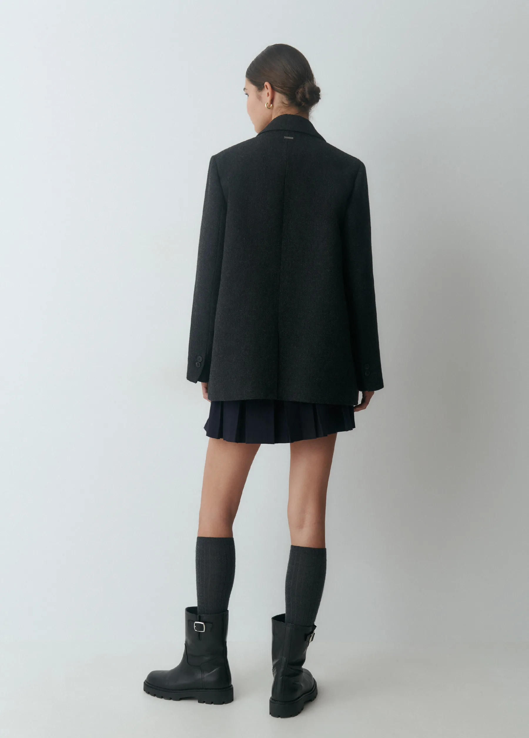 Americana cruzada de manga larga, cuello con solapas y bolsillos. Cierre mediante botones en el frontal.