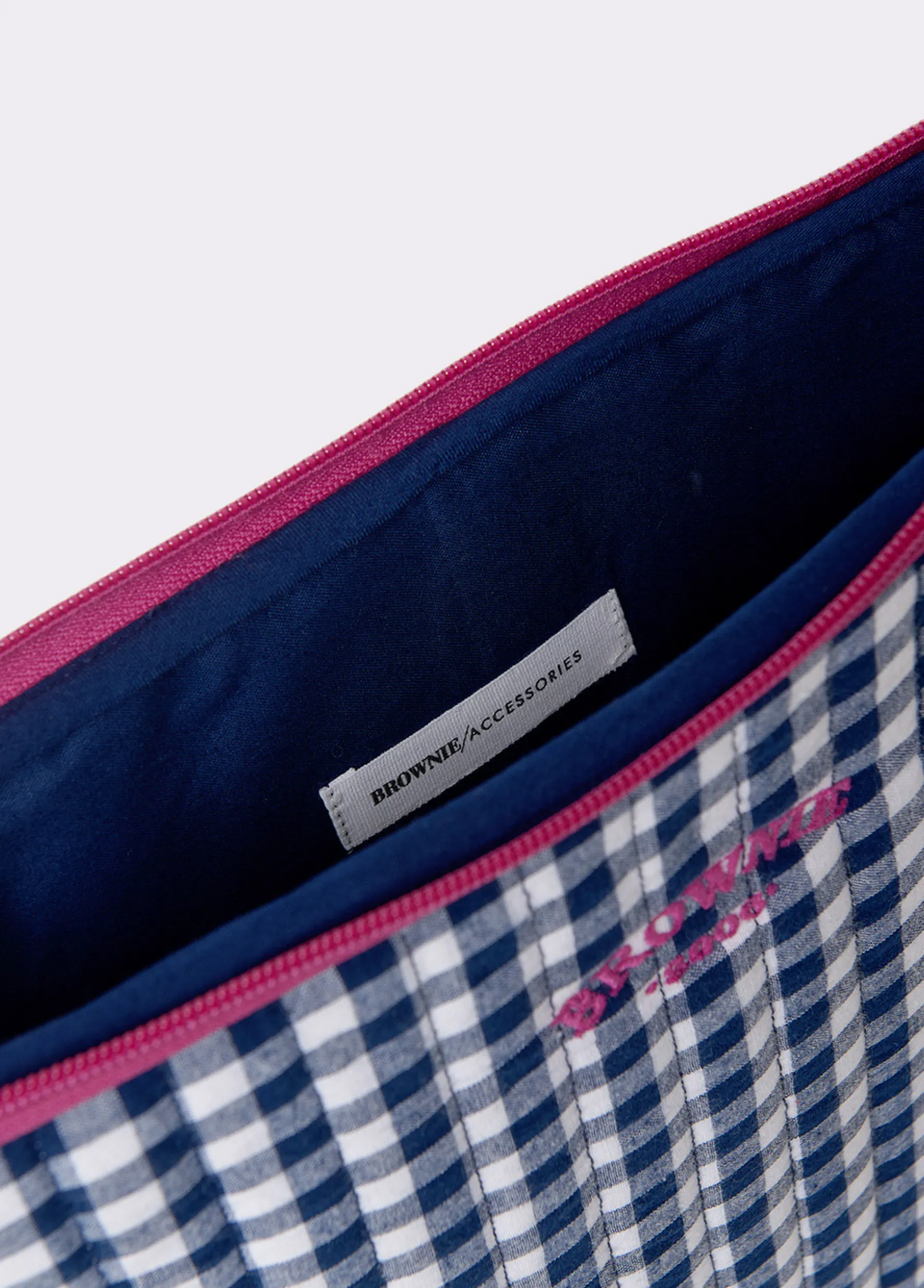 Funda de portátil de cuadros con logo Brownie y cierre mediante cremallera. Contiene un compartimento en la parte exterior