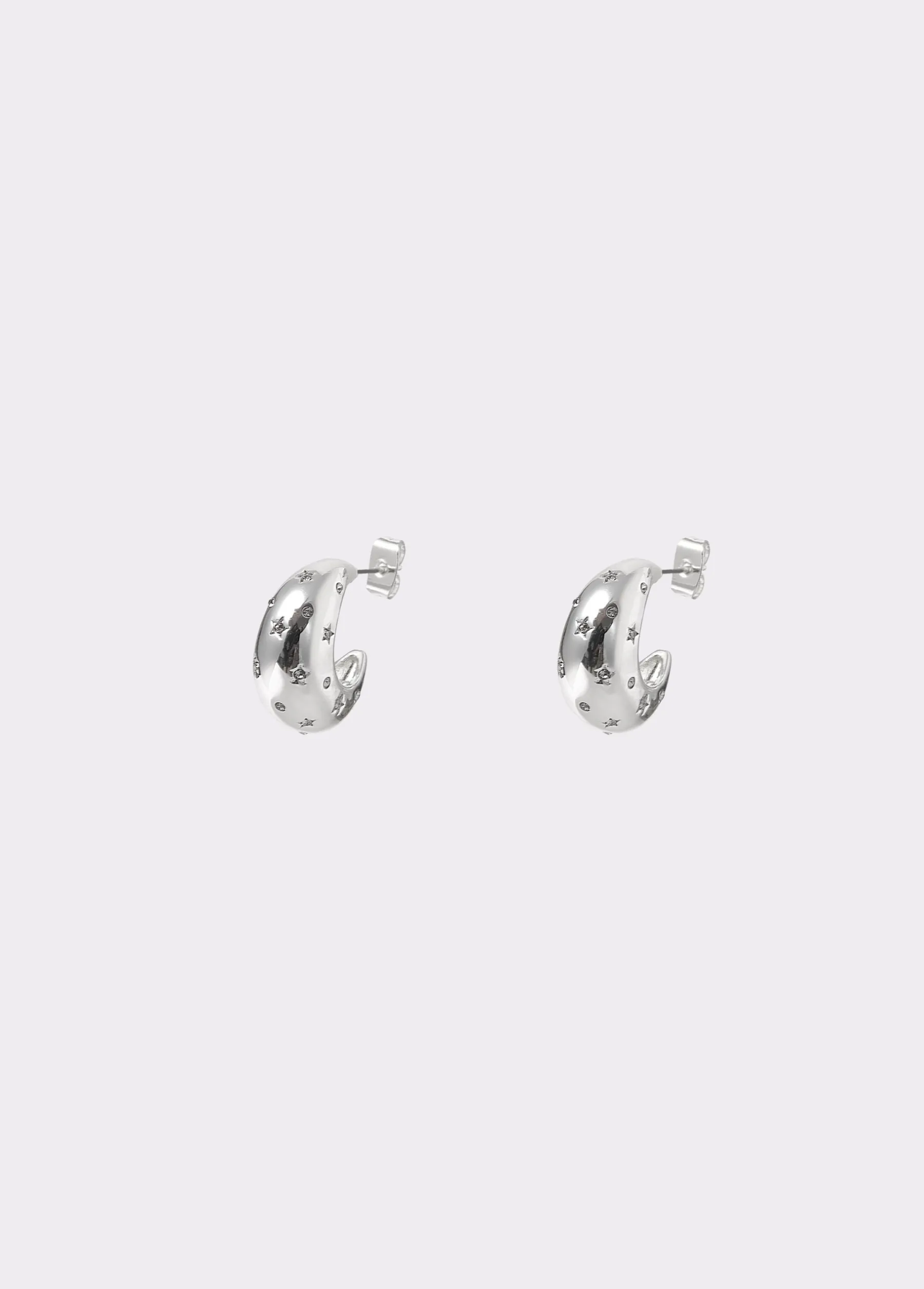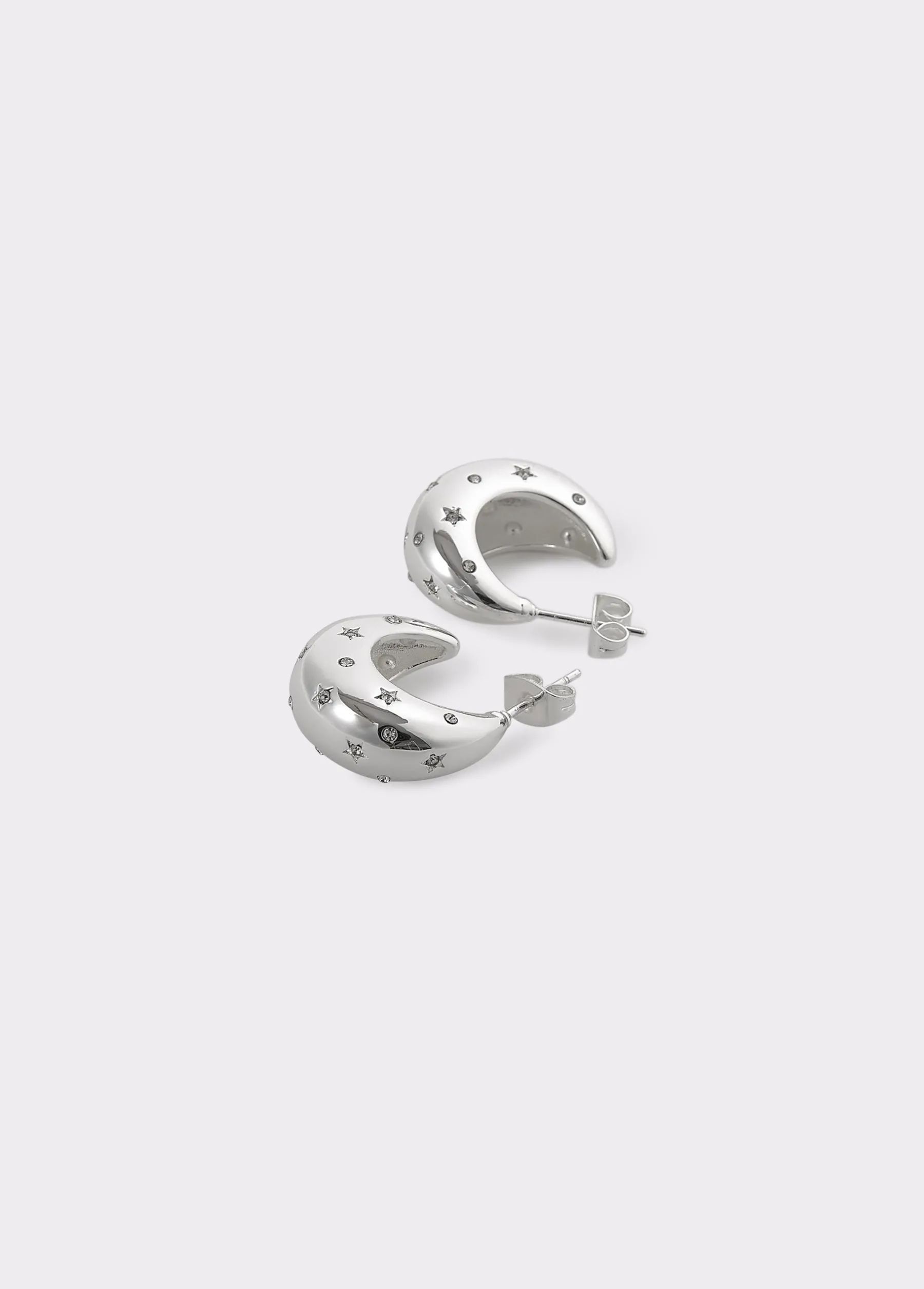 Pendientes plateados con brillantes y estrellas. Cierre de gancho.