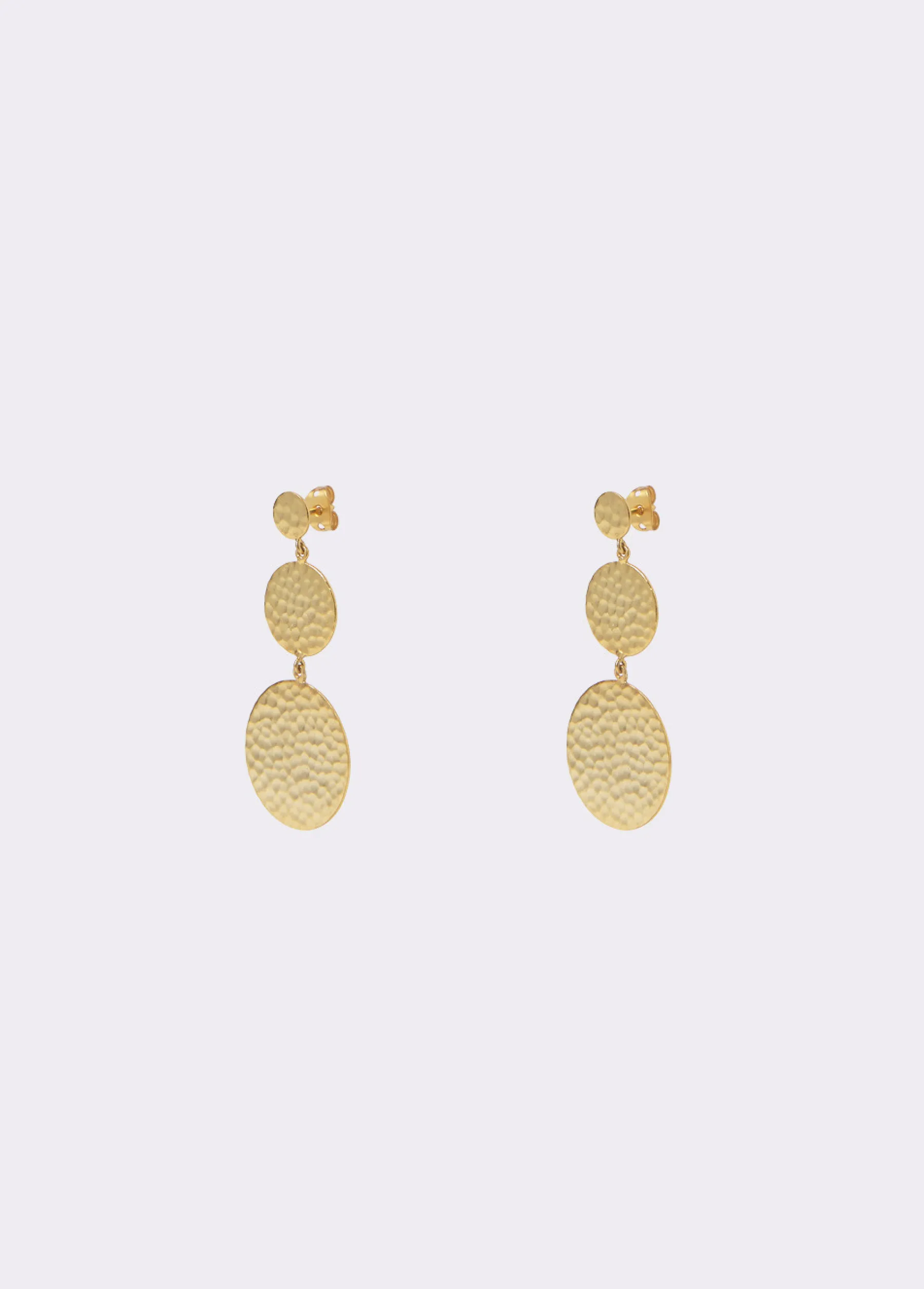 Pendientes largos dorados con forma de tres discos. Cierre de presión.