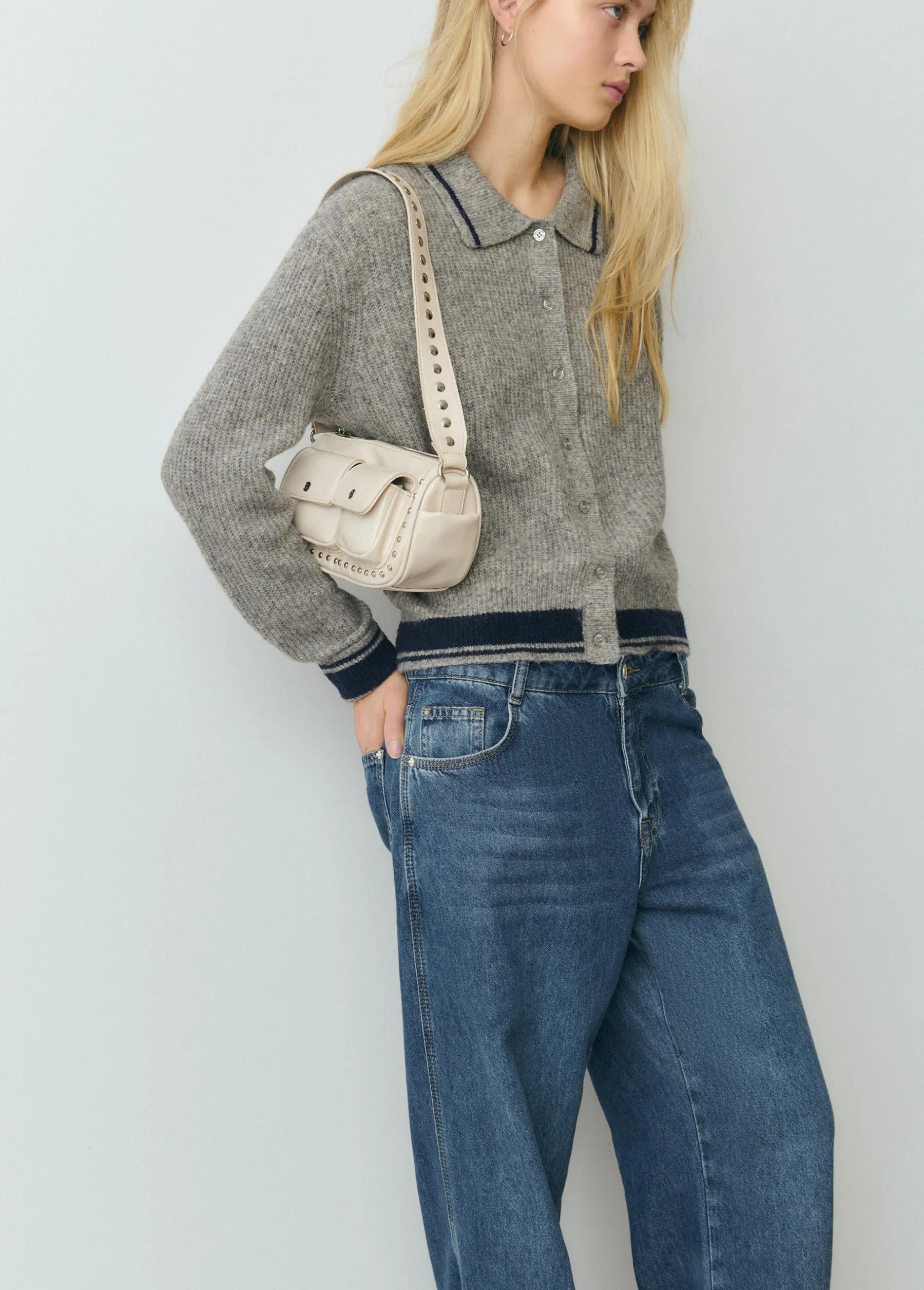 Bolso de hombro liso con asa ancha corta y bolsillos en el frontal con detalle de tachas. Cierre mediante cremallera.