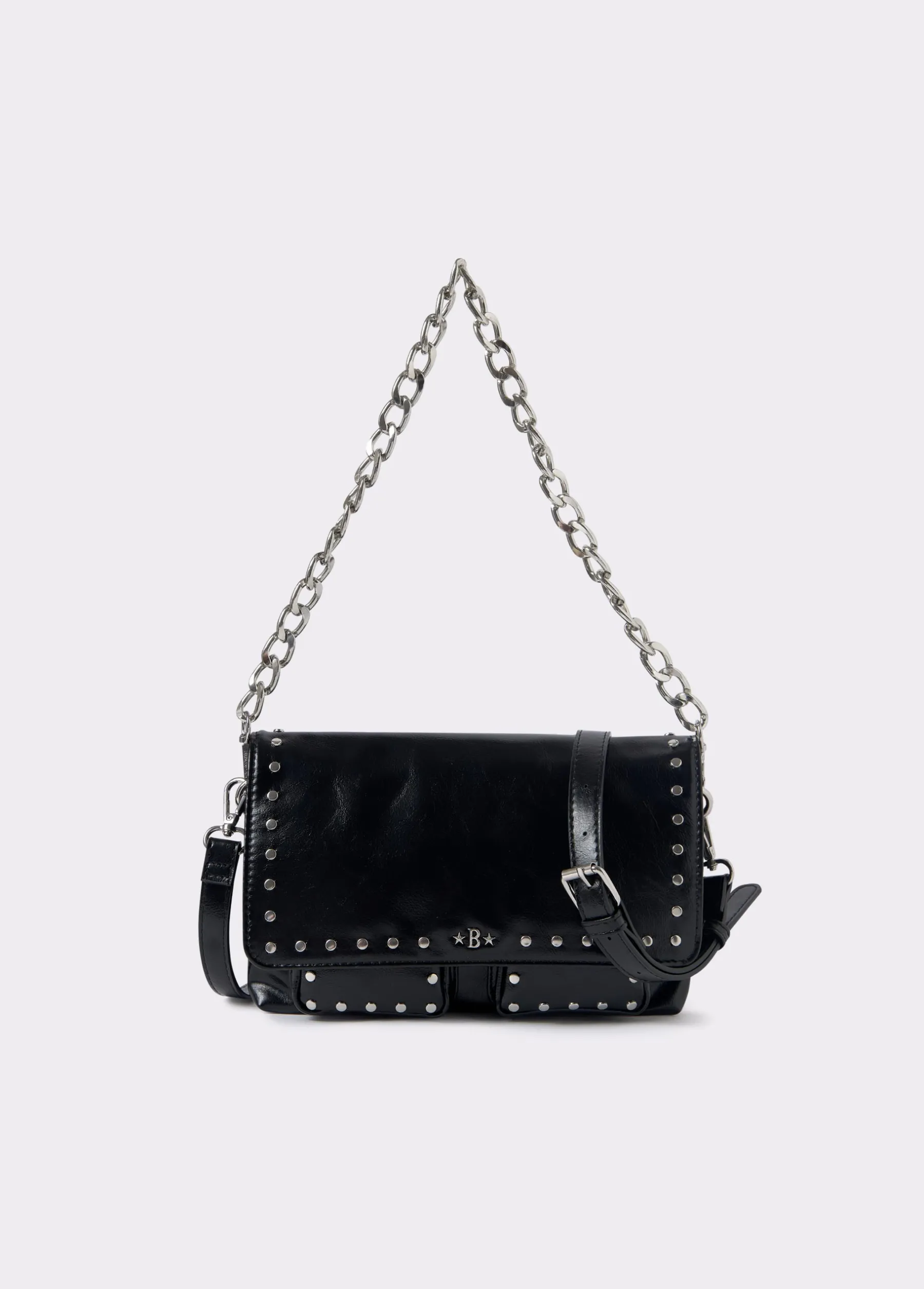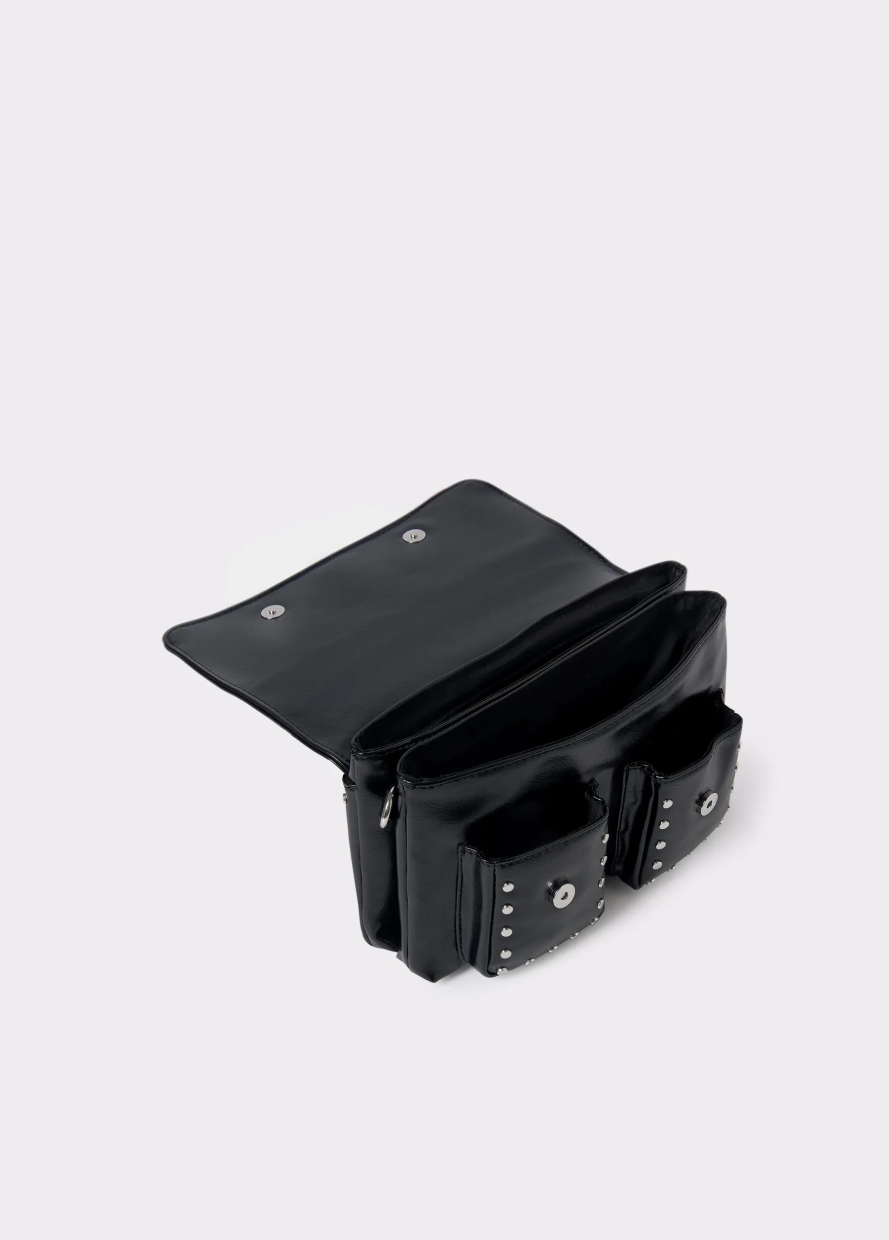 Bolso de hombro en color negro con solapa, bolsillos y detalle de tachas en la parte delantera. Dispone de doble correa, ambas extraíbles; una más corta para colgar del hombro y otra más larga para llevar de bandolera.