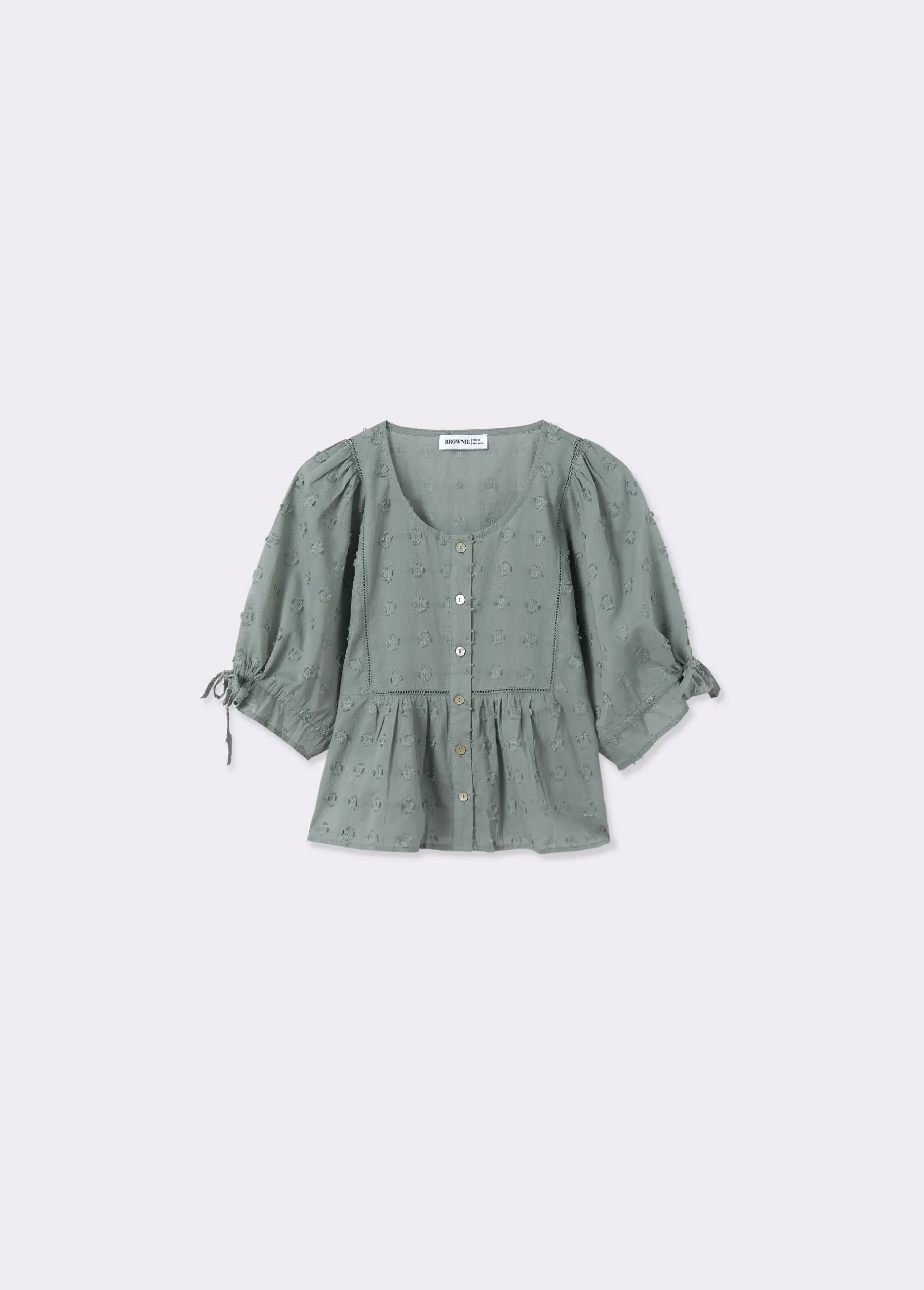 Blusa fluida de manga corta con fruncido, cuello redondo y botones en el frontal.
