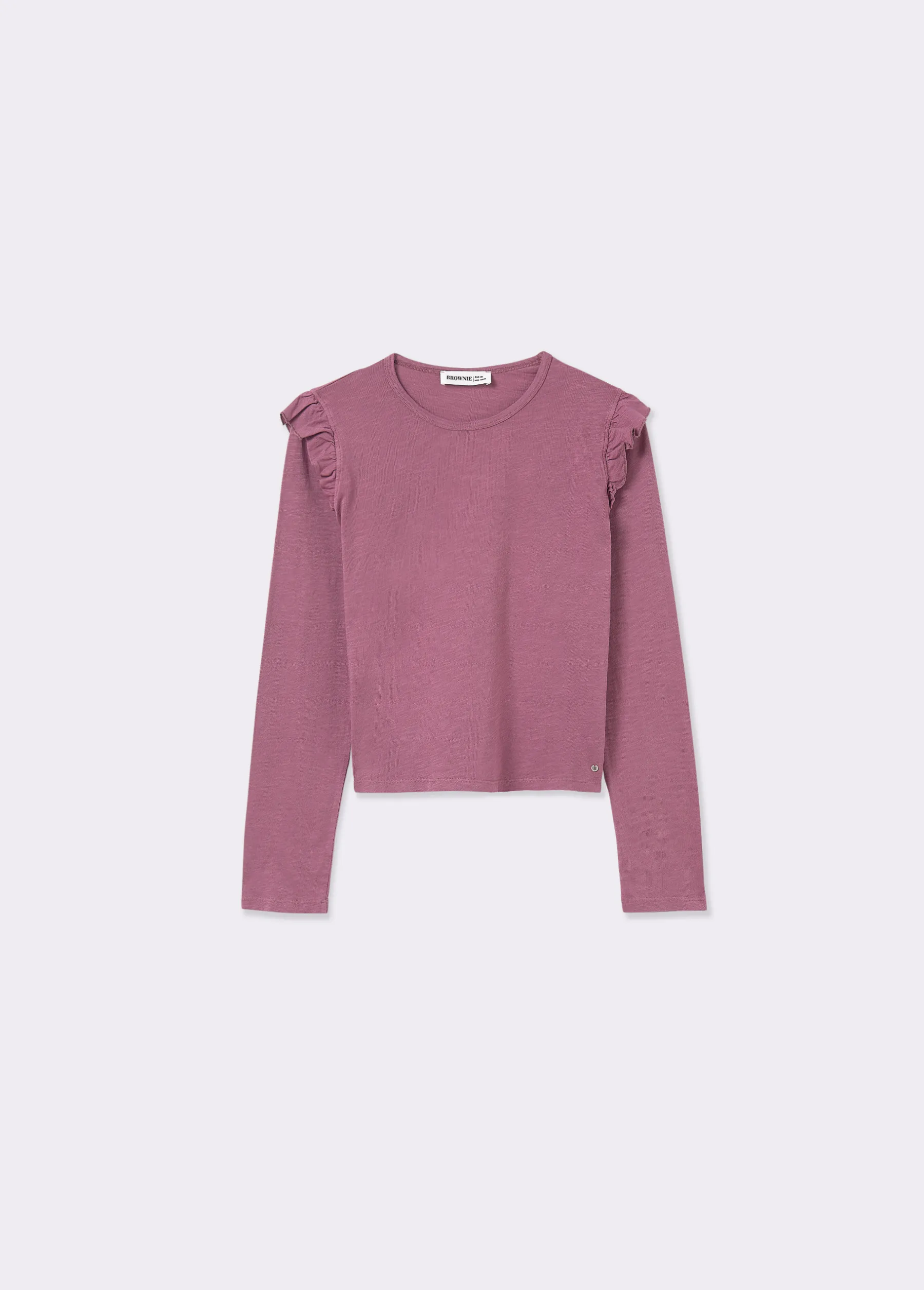 Camiseta de manga larga, cuello redondo y detalle de volantes.