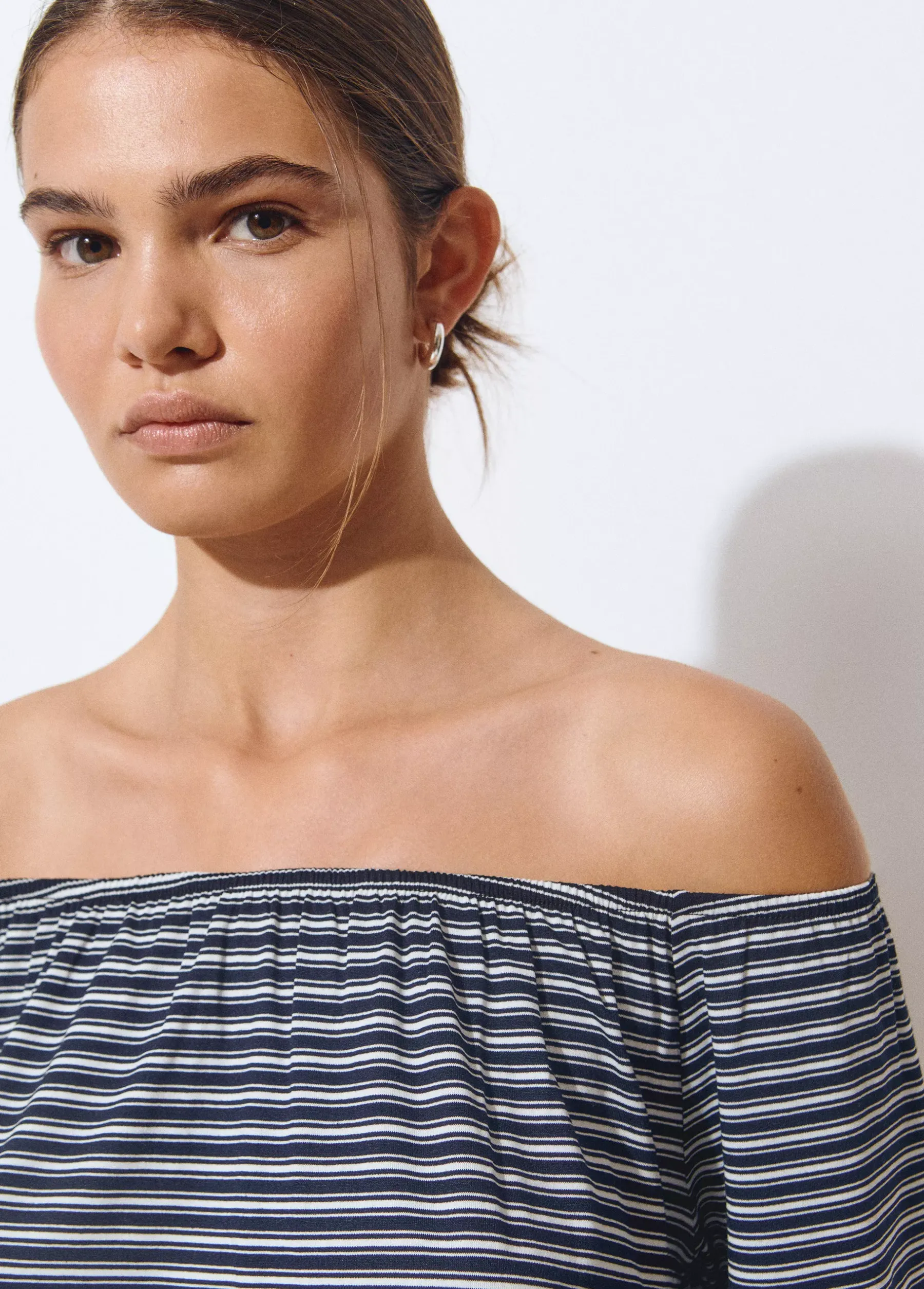 Camiseta de rayas de manga larga abullonada, escote bardot y lazada en la parte inferior.