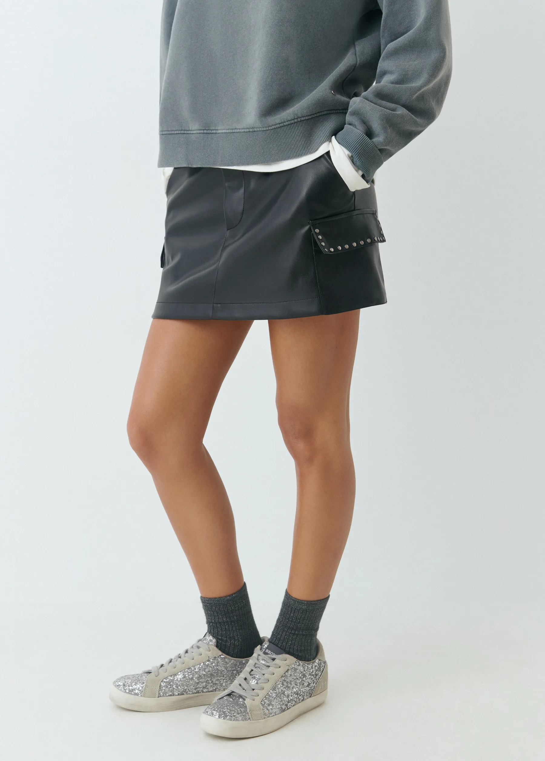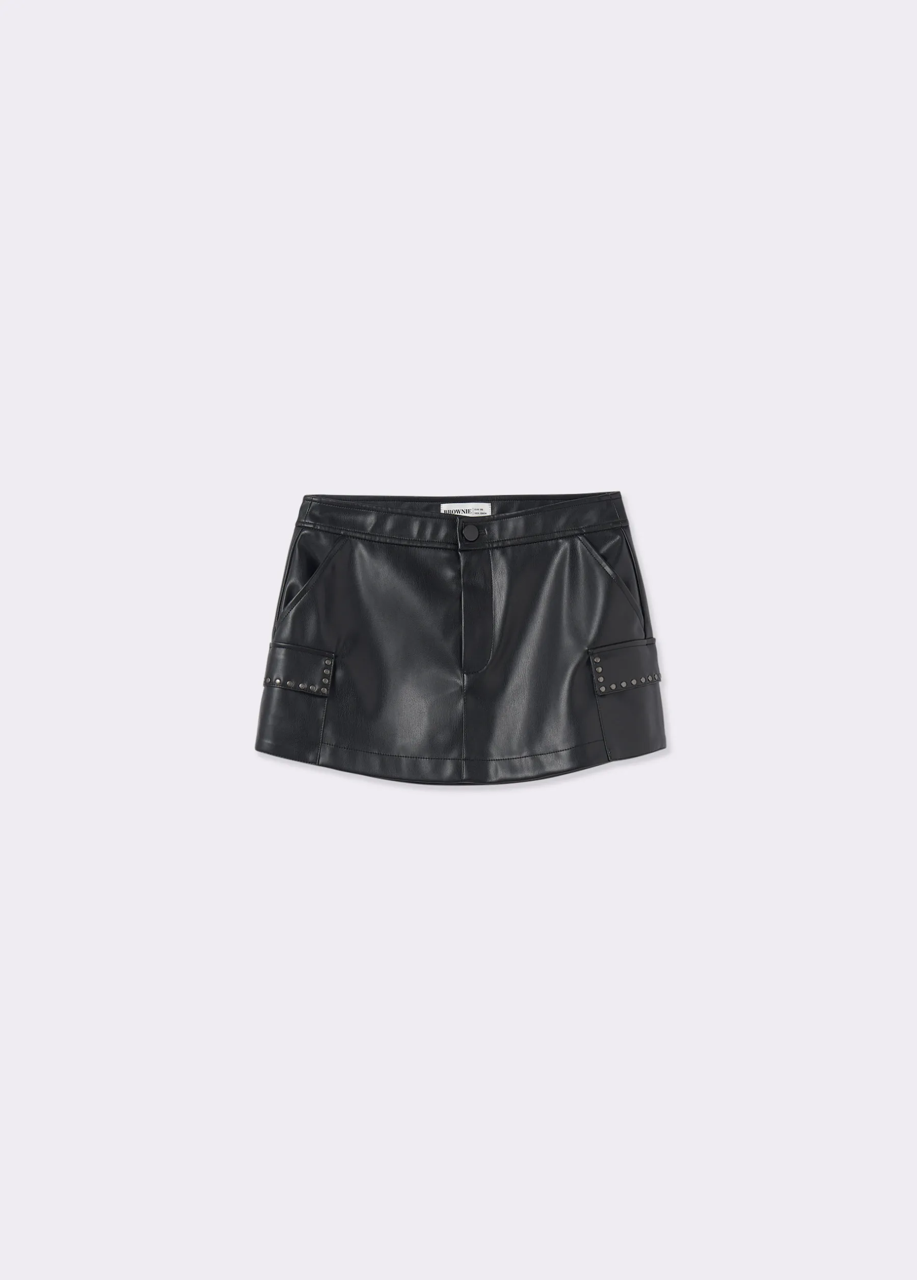 Falda corta efecto piel con detalle de bolsillos con tachas. Cierre mediante cremallera y botón.