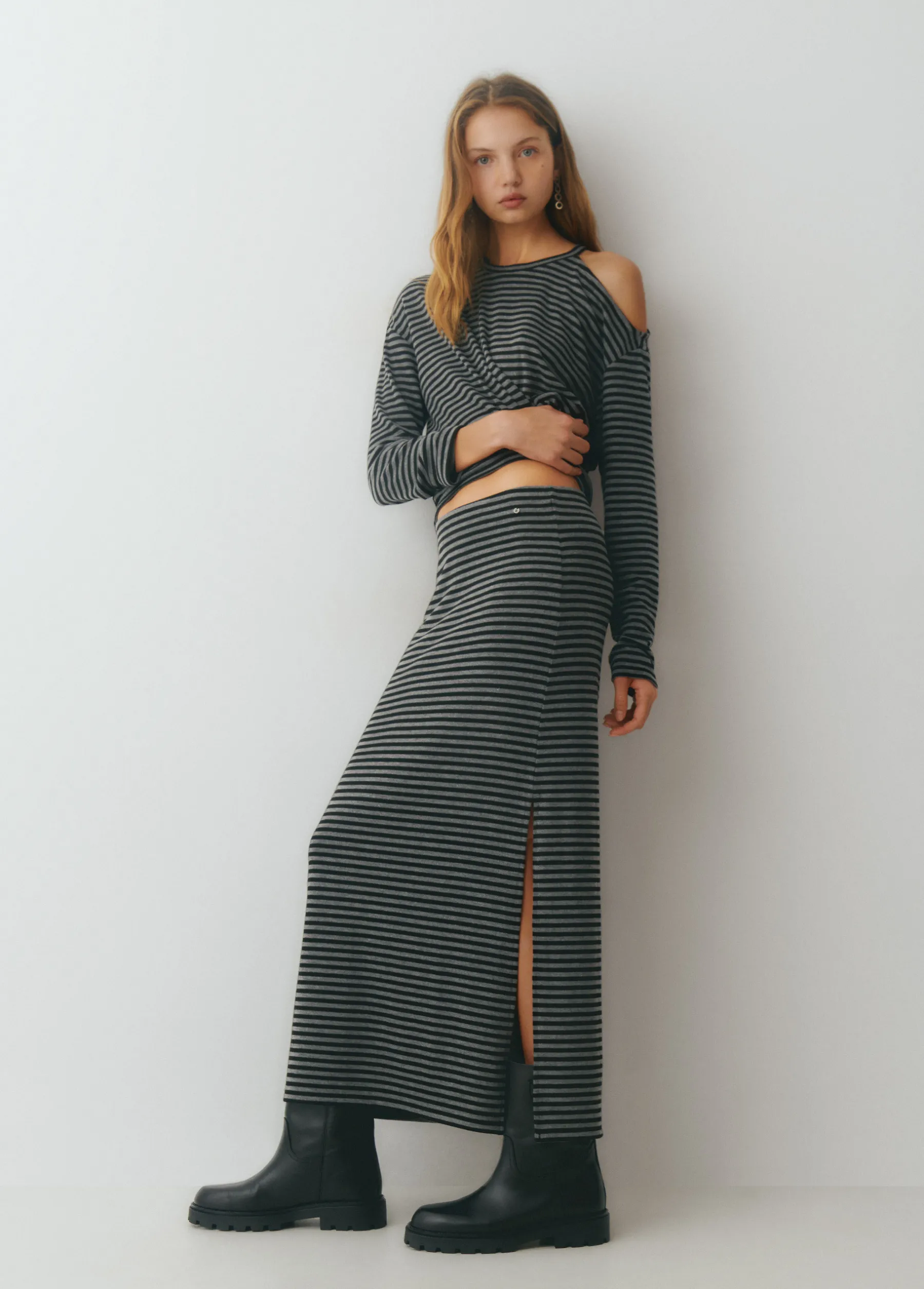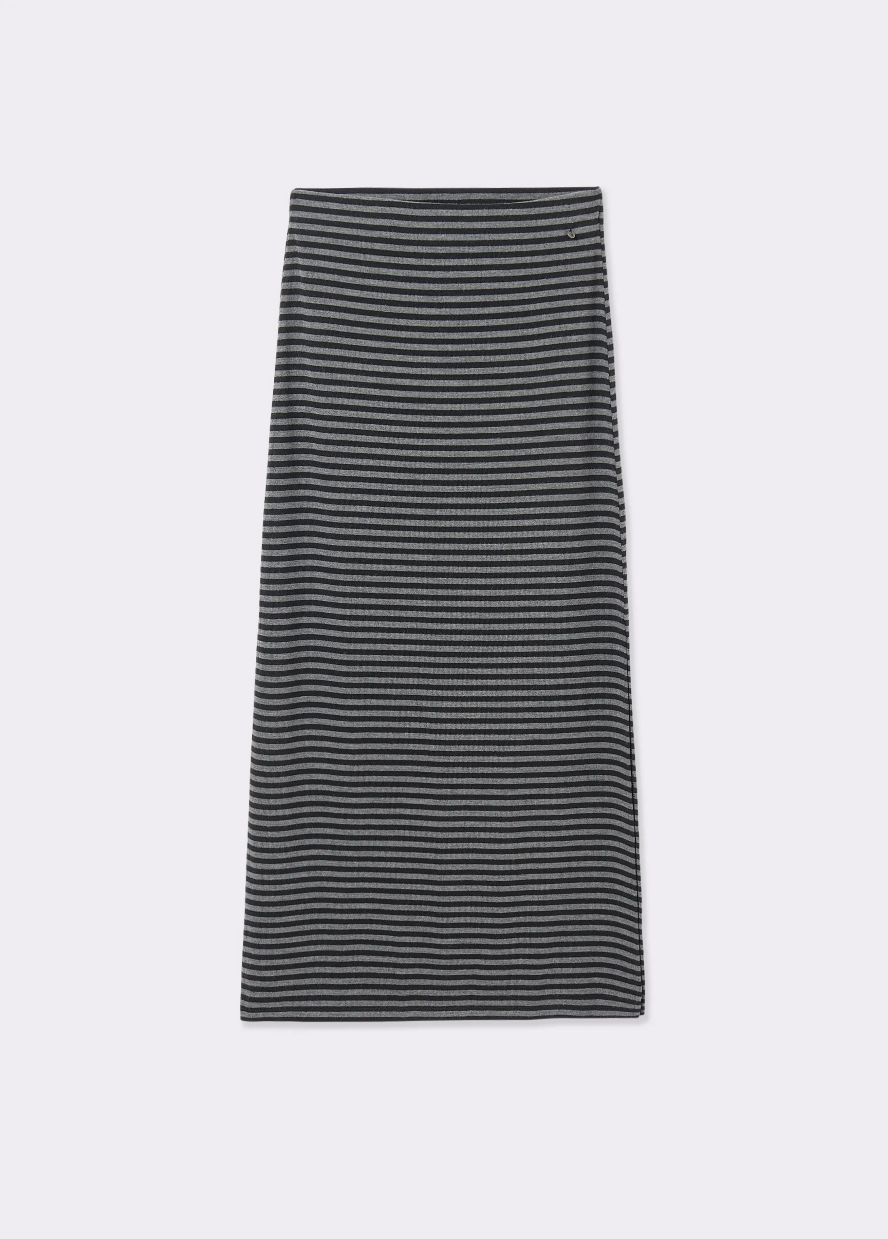 Falda midi de rayas con detalle de apertura en el lateral.