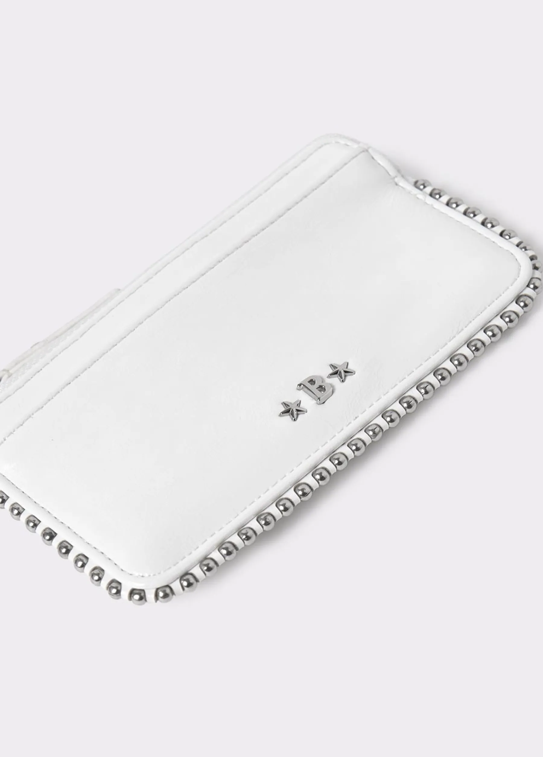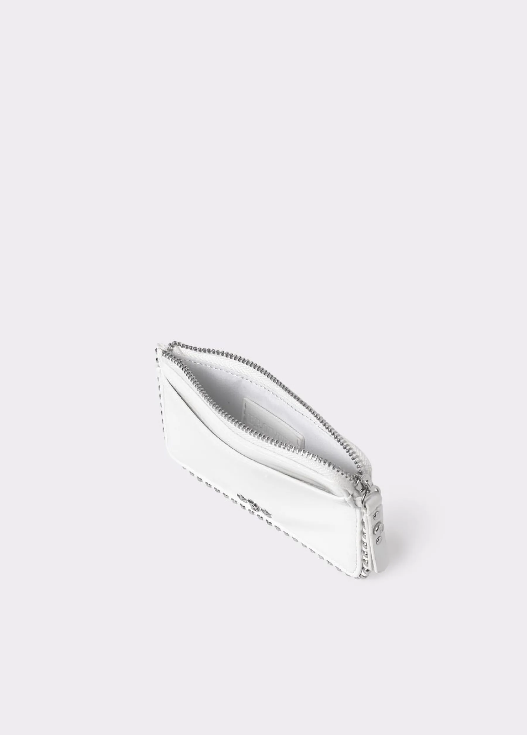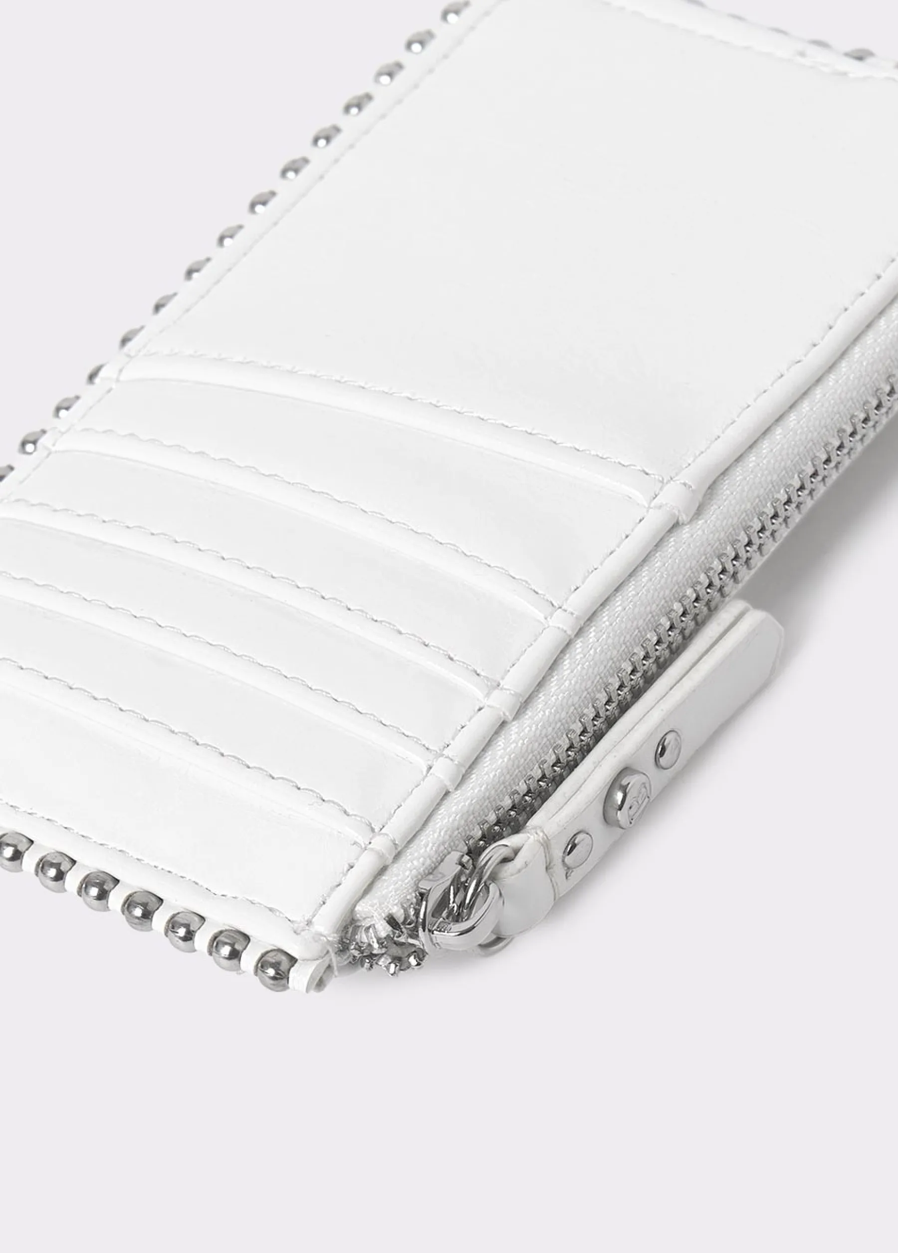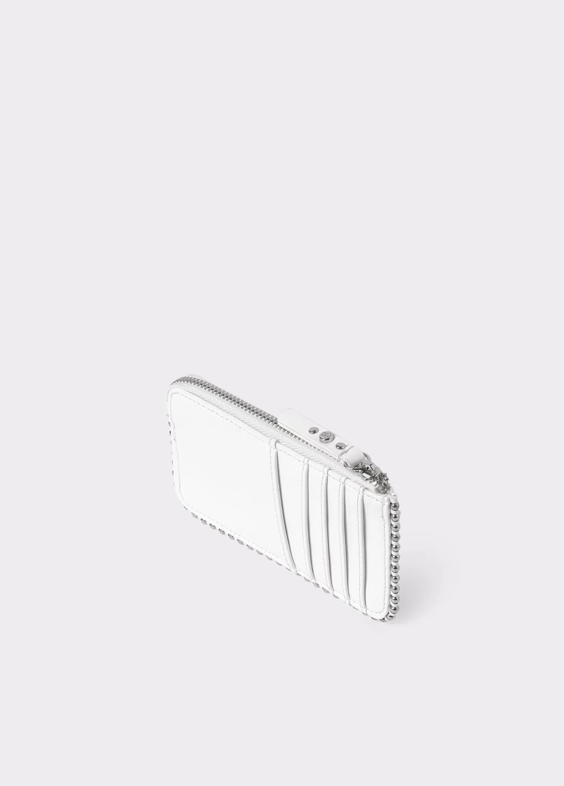 Tarjetero color blanco con detalle de bolitas en plateado. Dispone de cremallera para guardar monedas y de ranuras para tarjetas.