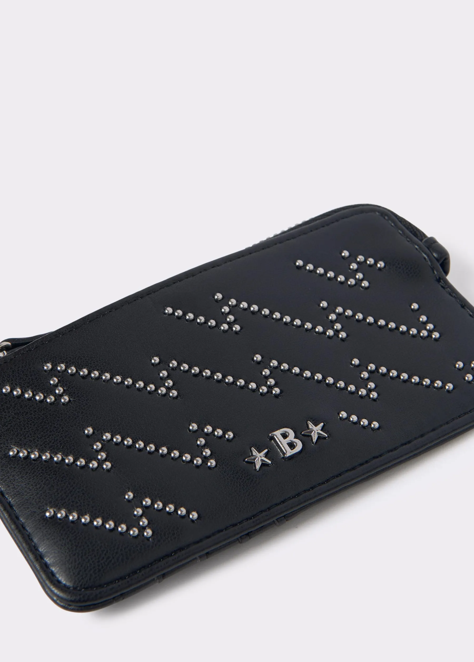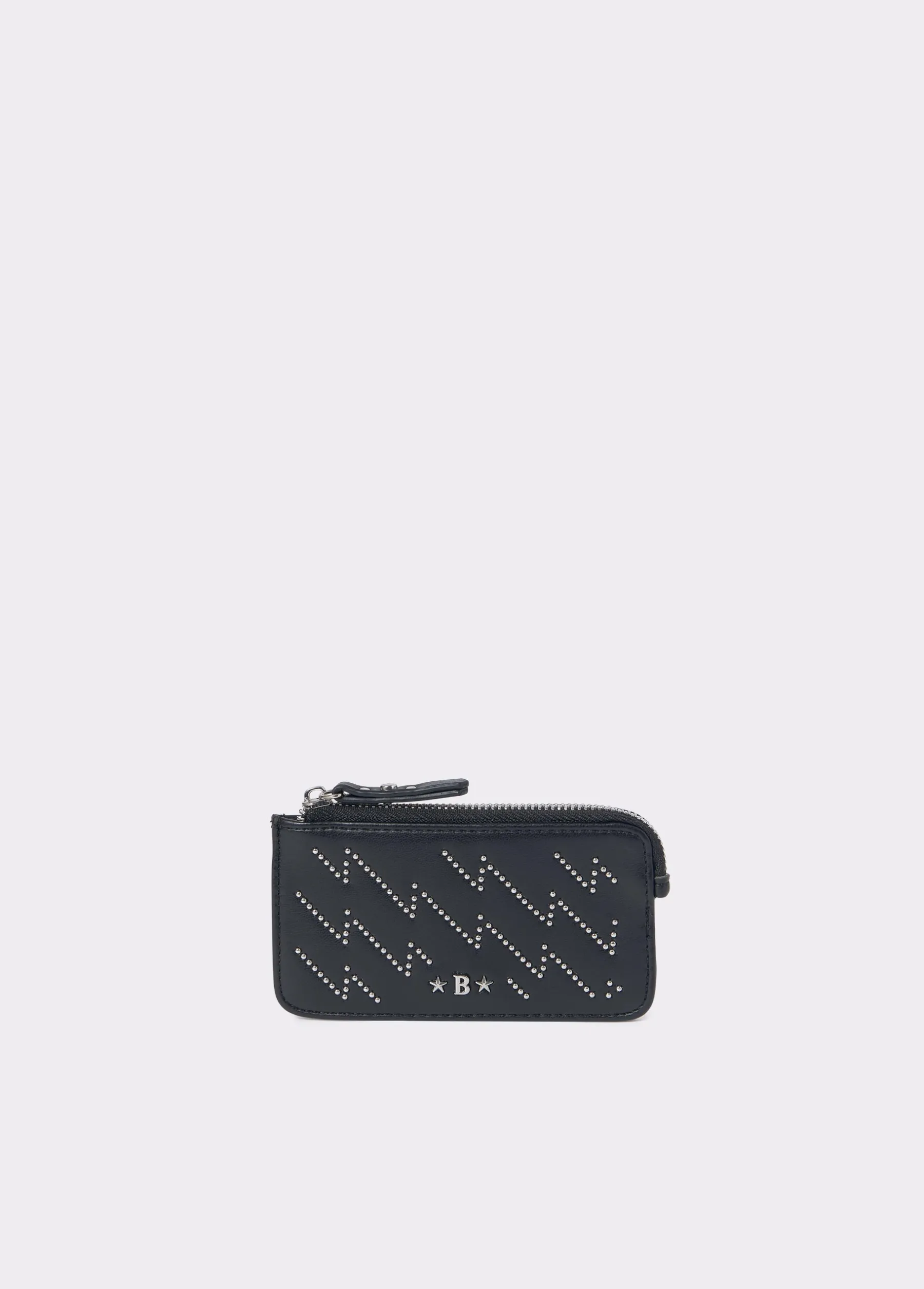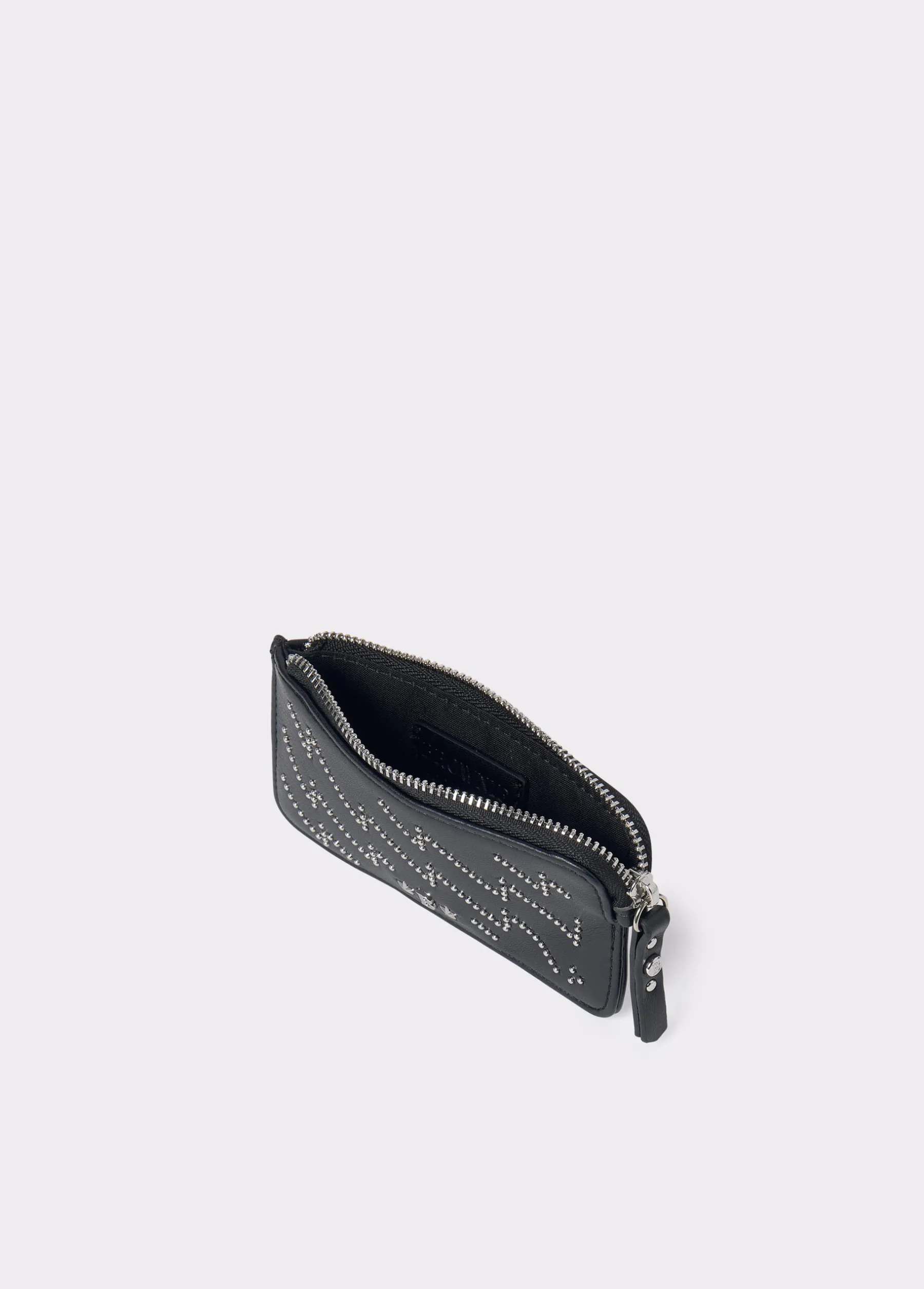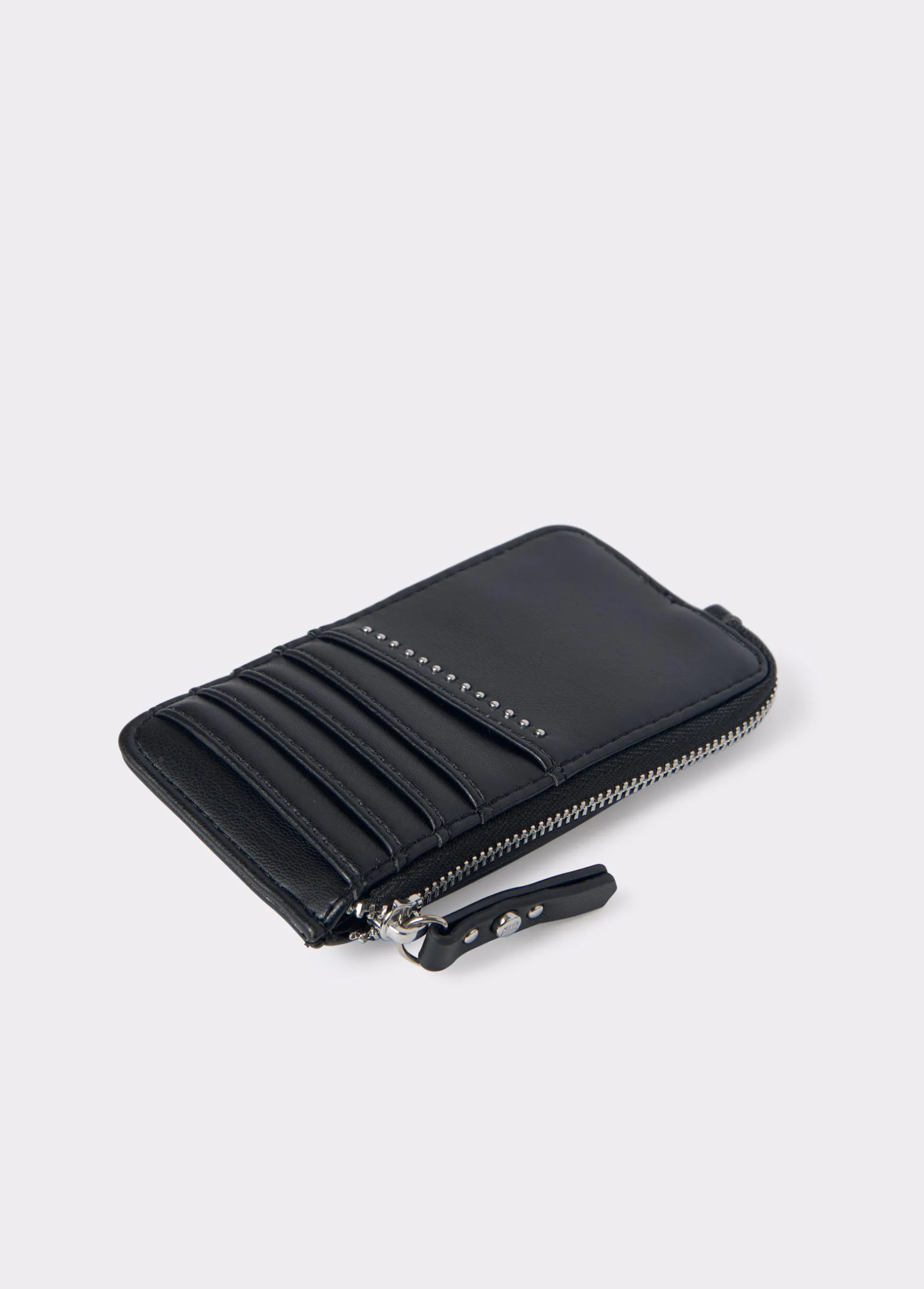 Tarjetero color negro con detalle de tachas en plateado. Dispone de cremallera para guardar monedas y en el trasero ranuras para tarjetas.