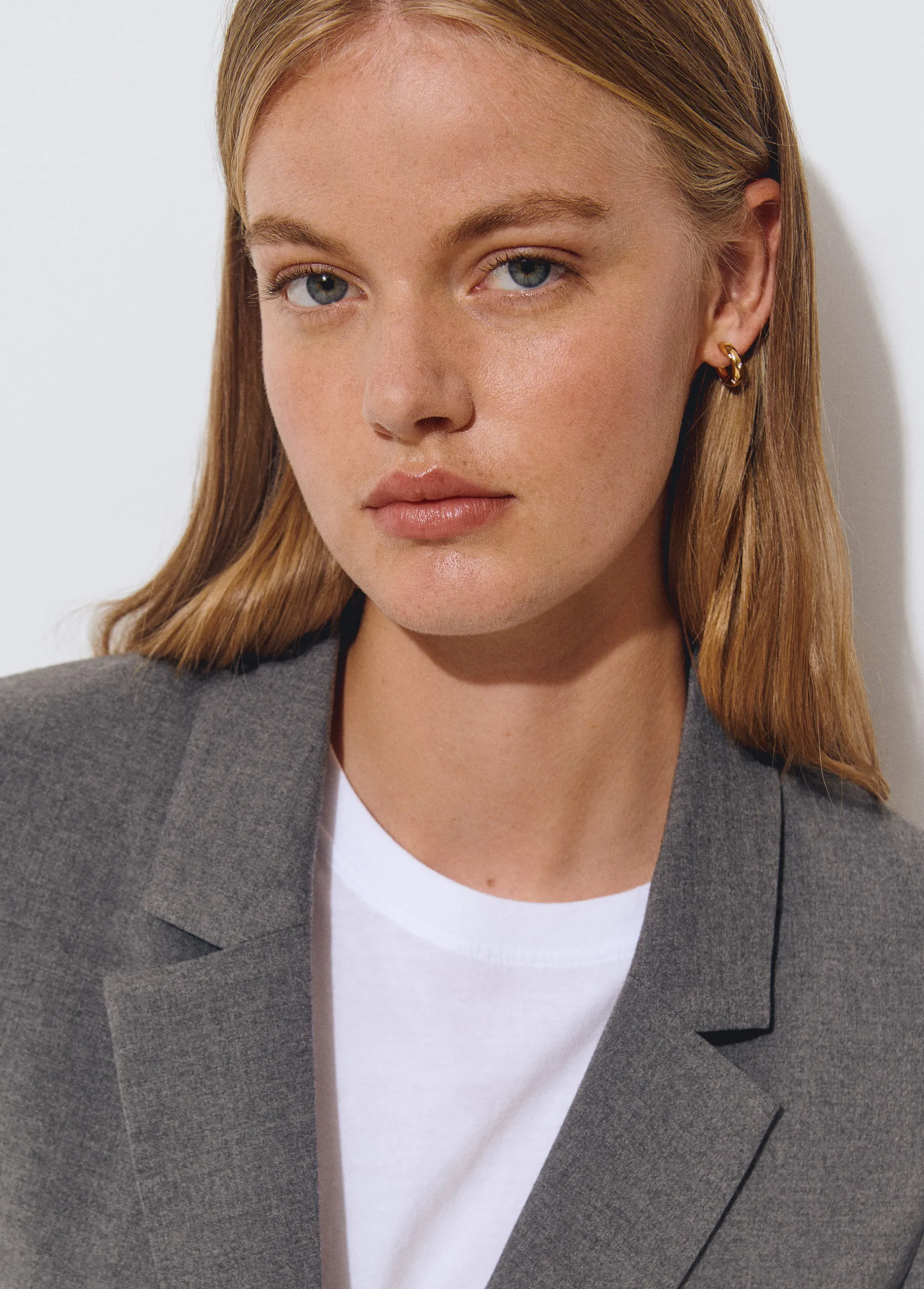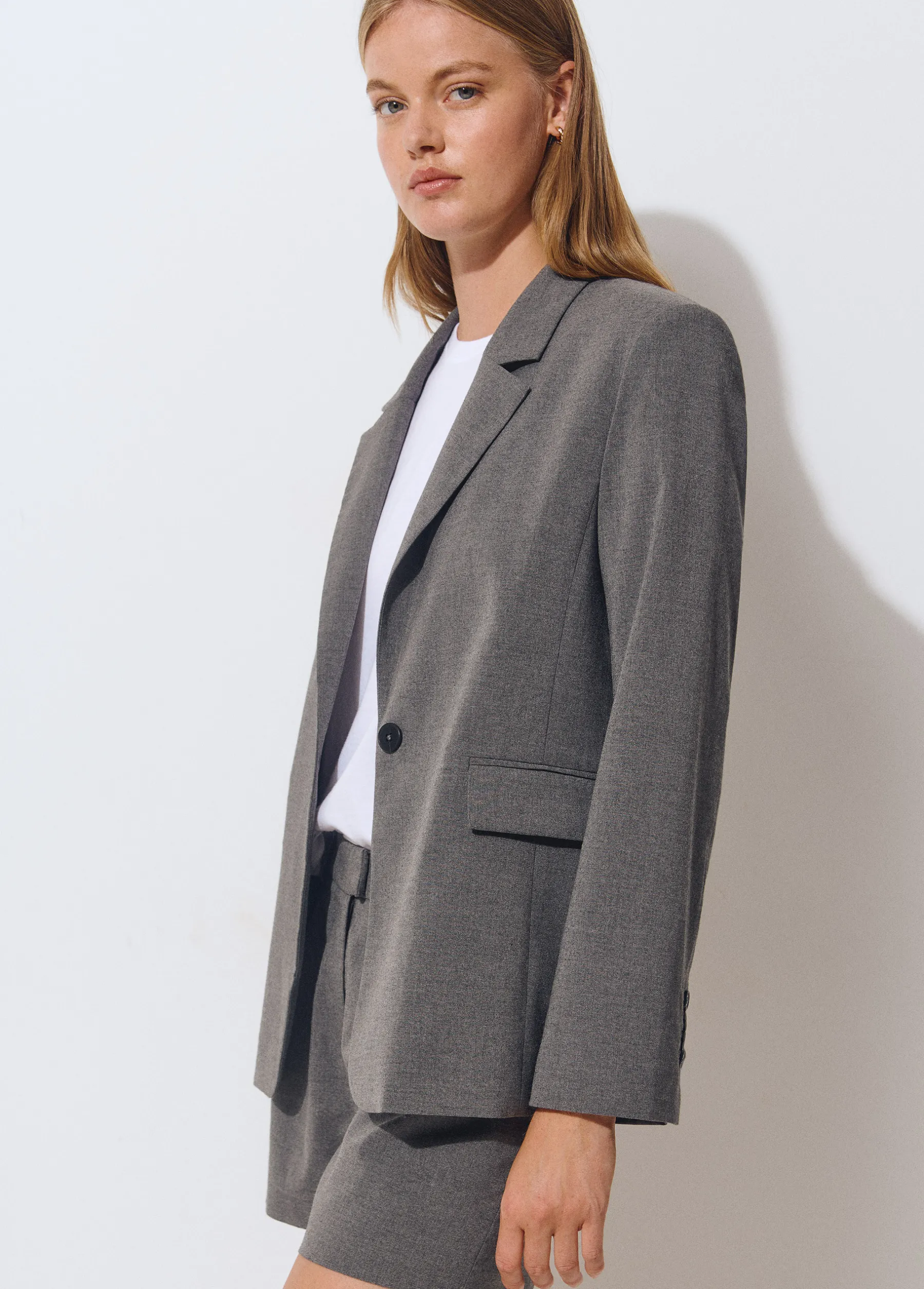 Americana lisa de manga larga, cuello con solapas, bolsillos y cierre mediante botón en el frontal.