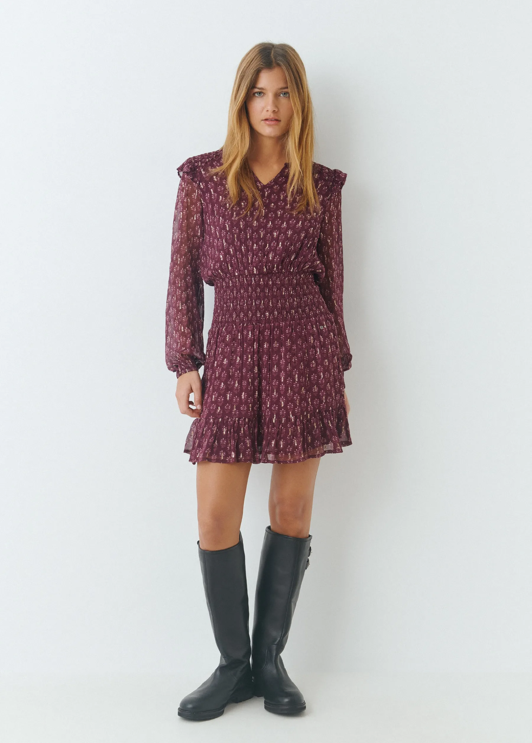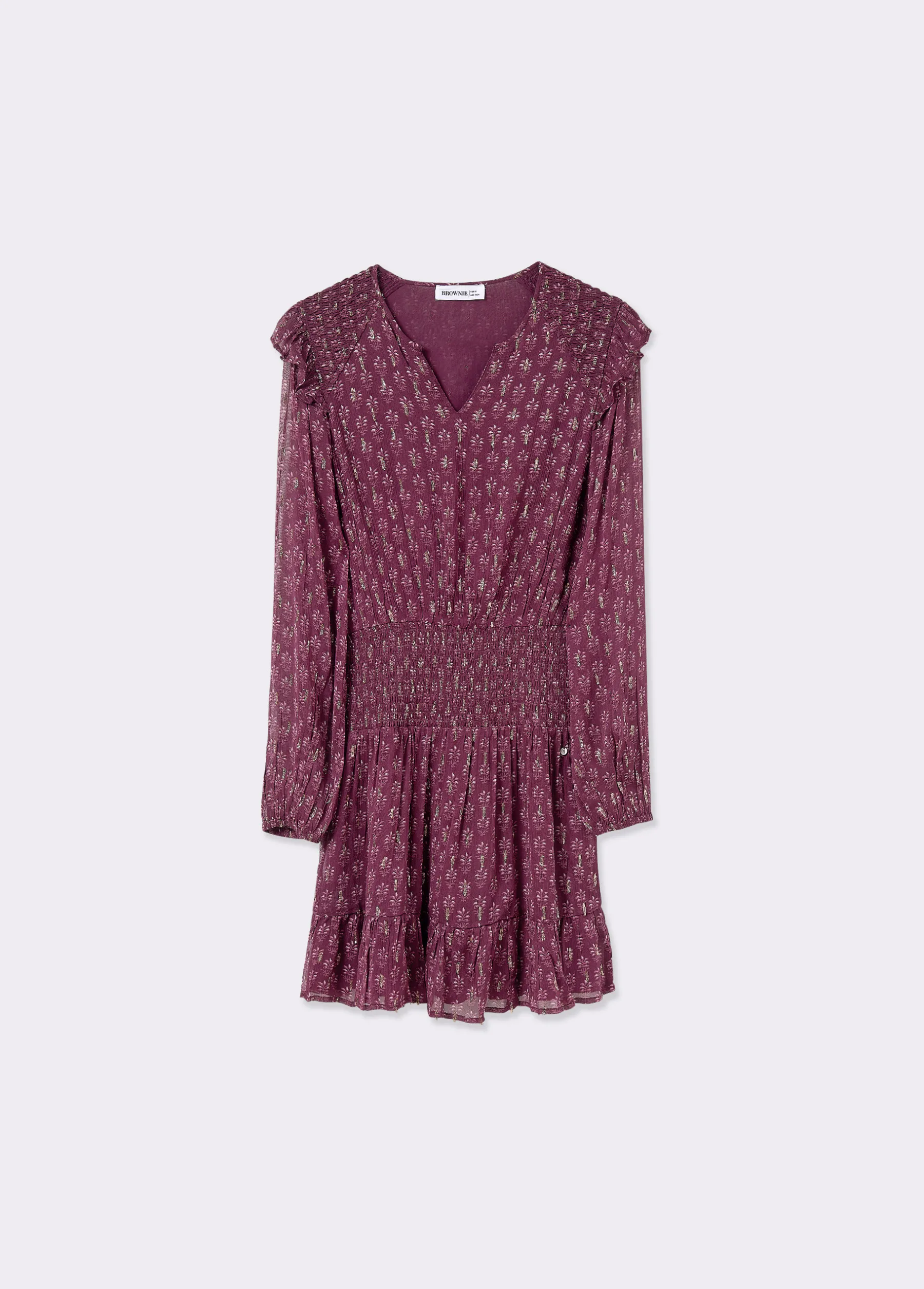 Vestido con estampado sello indio de manga larga, cuello redondo y cintura con smock.