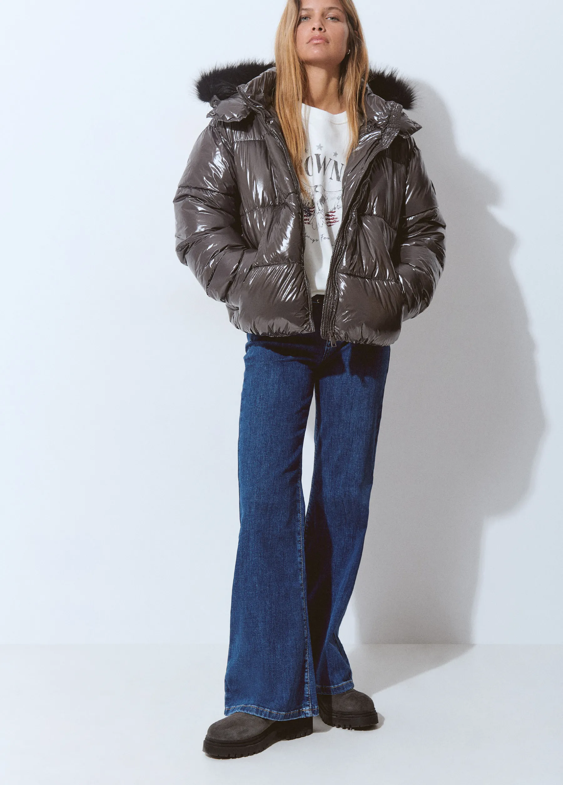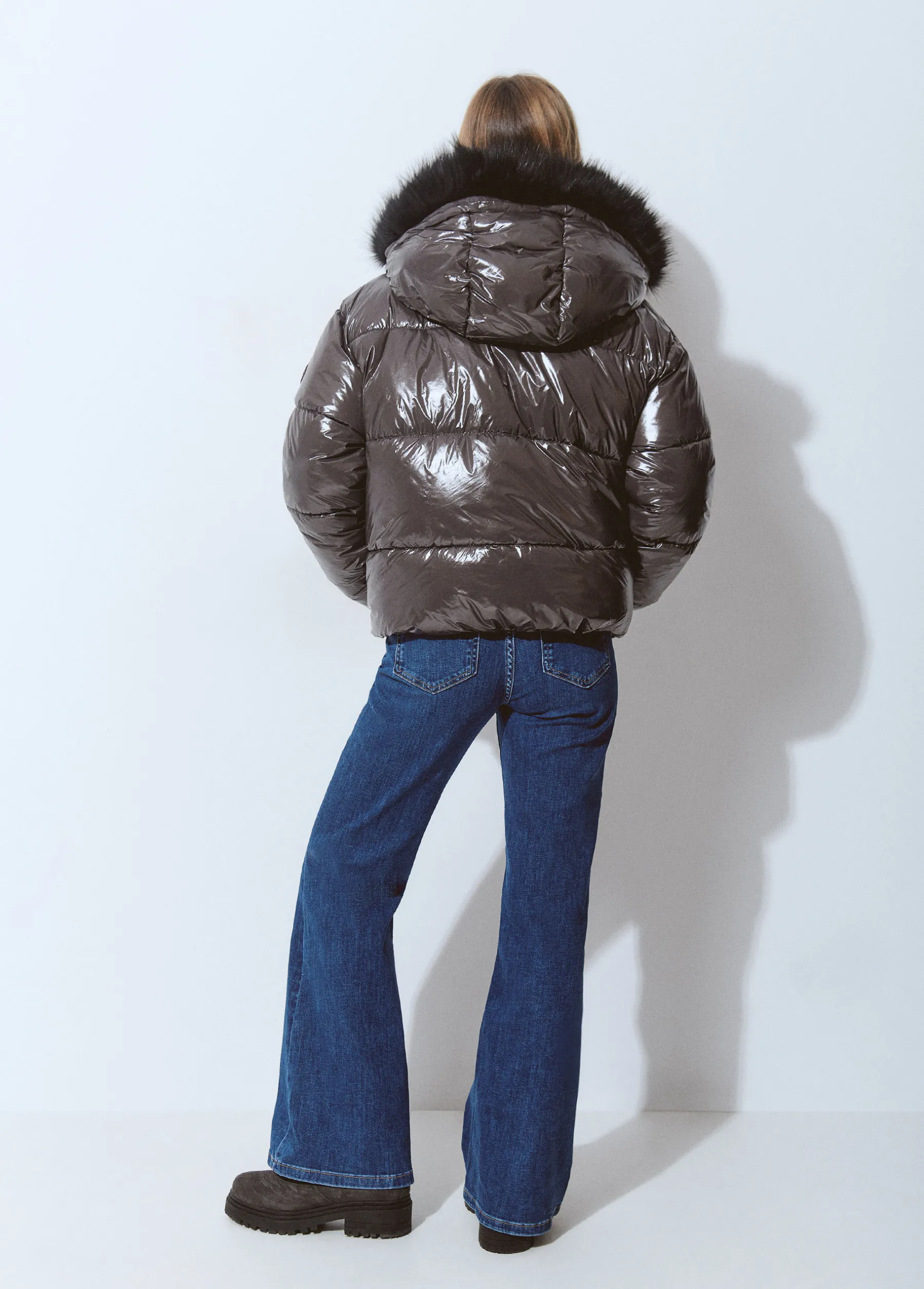 Abrigo corto acolchado vinilado con bolsillos frontales y capucha con pelo extraíble. Cierre mediante cremallera y botones.
