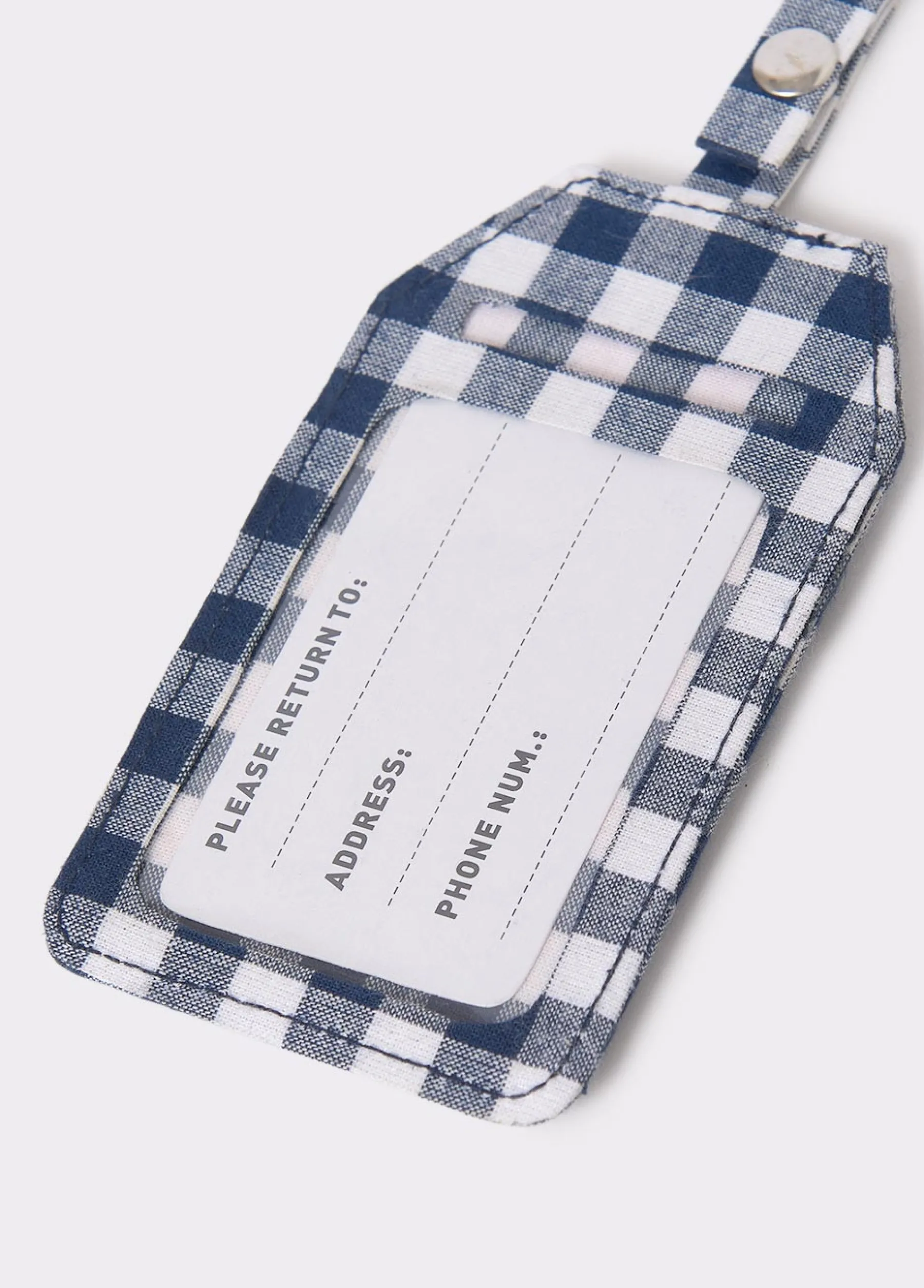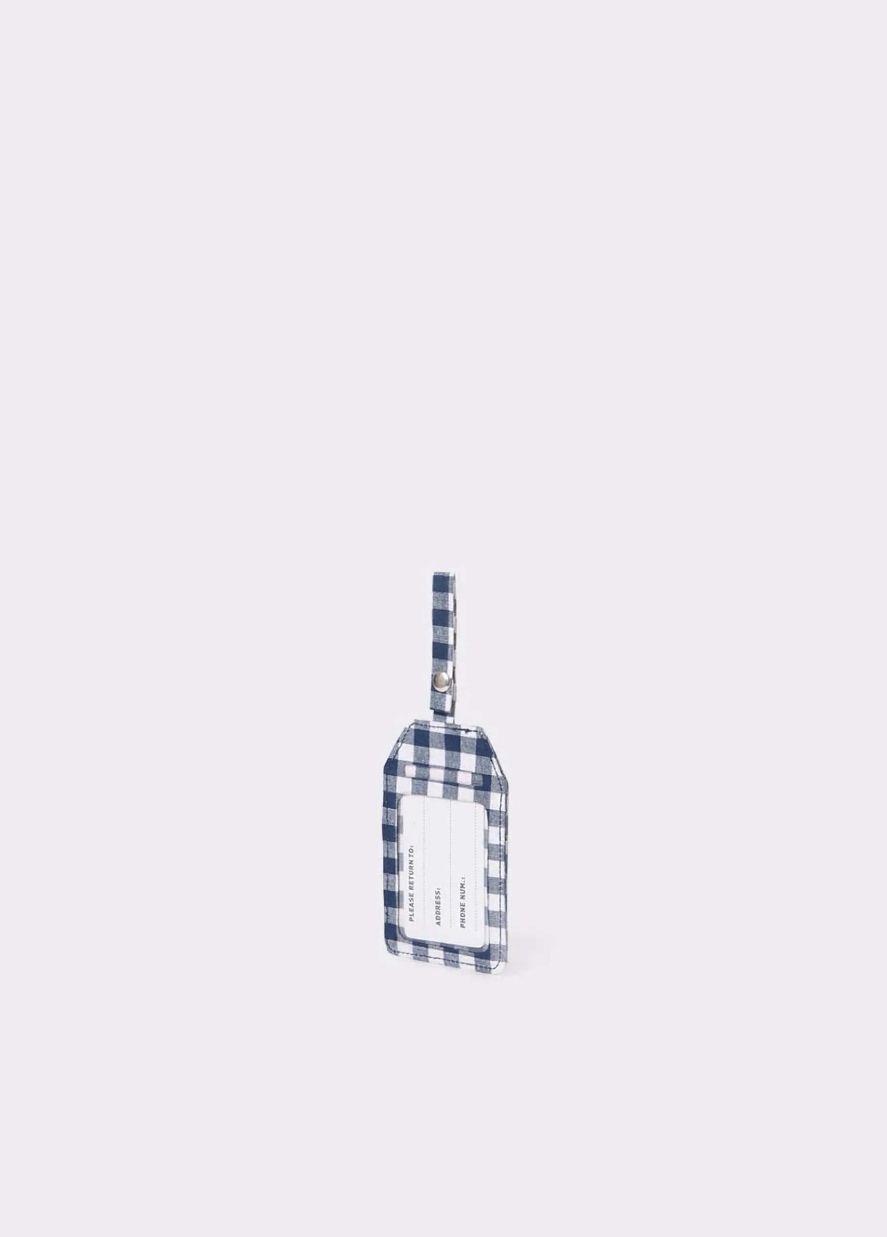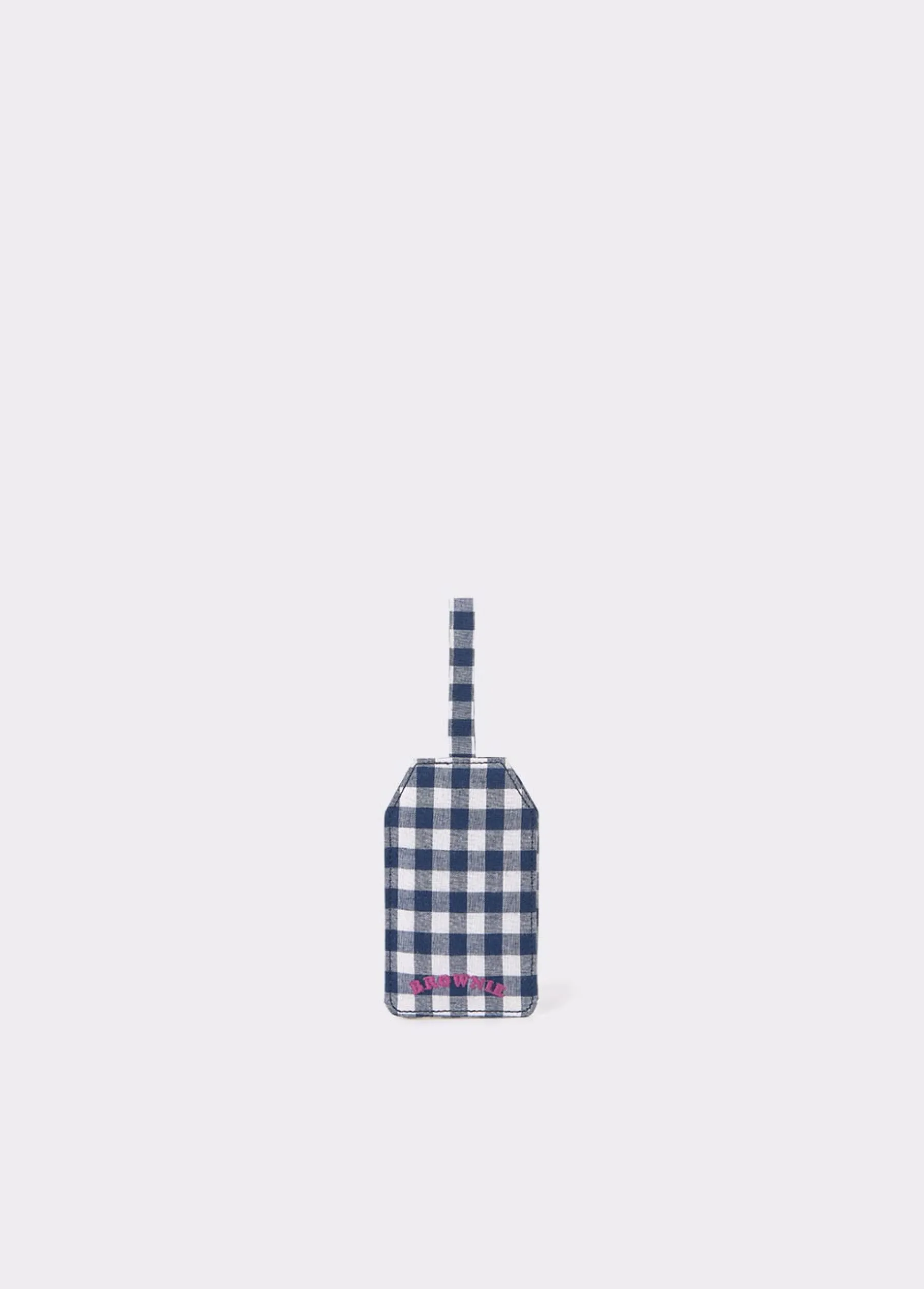 Etiqueta de cuadros de maleta con logo Brownie en la parte trasera y con espacios para añadir datos personales.