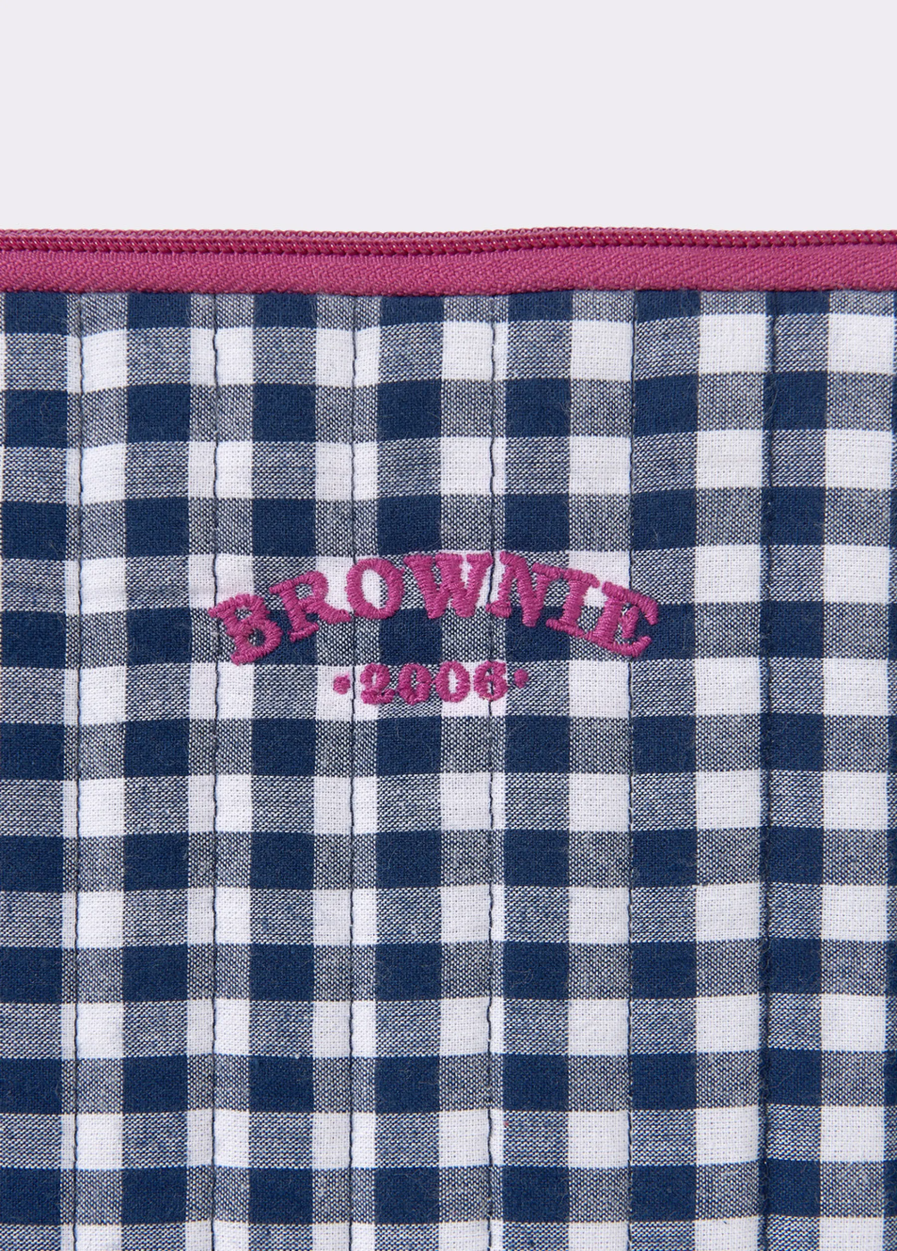 Funda de portátil de cuadros con logo Brownie y cierre mediante cremallera. Contiene un compartimento en la parte exterior