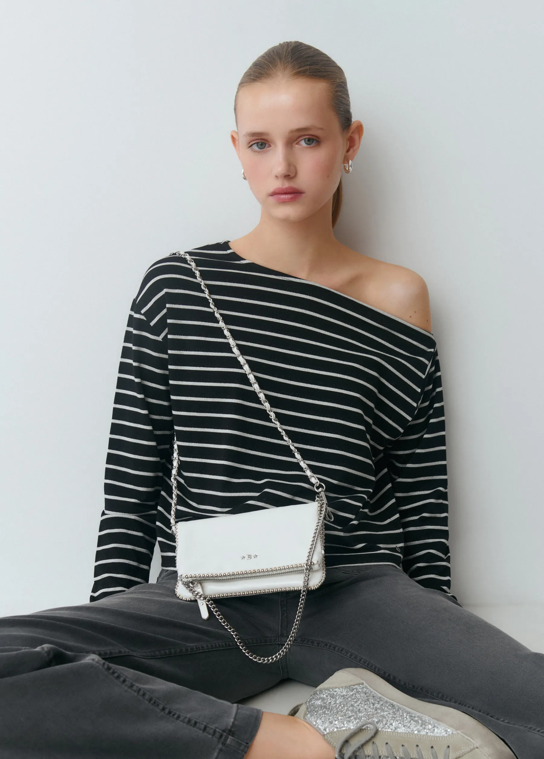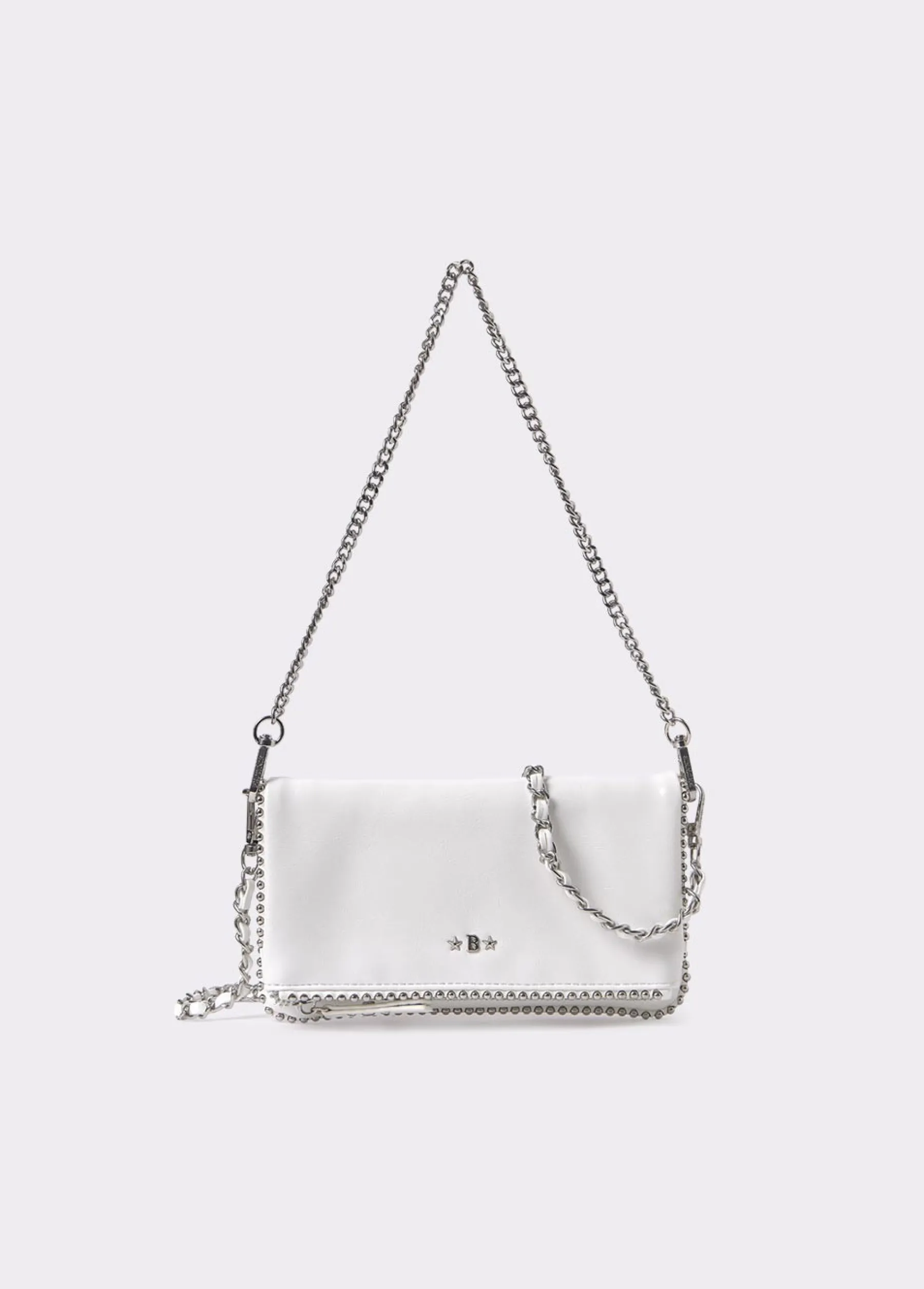 Bolso de hombro mini en color blanco con detalle de bolitas plateadas en la parte delantera. Dispone de doble correa, ambas extraíbles; una más corta para colgar del hombro y otra más larga para llevar de bandolera.