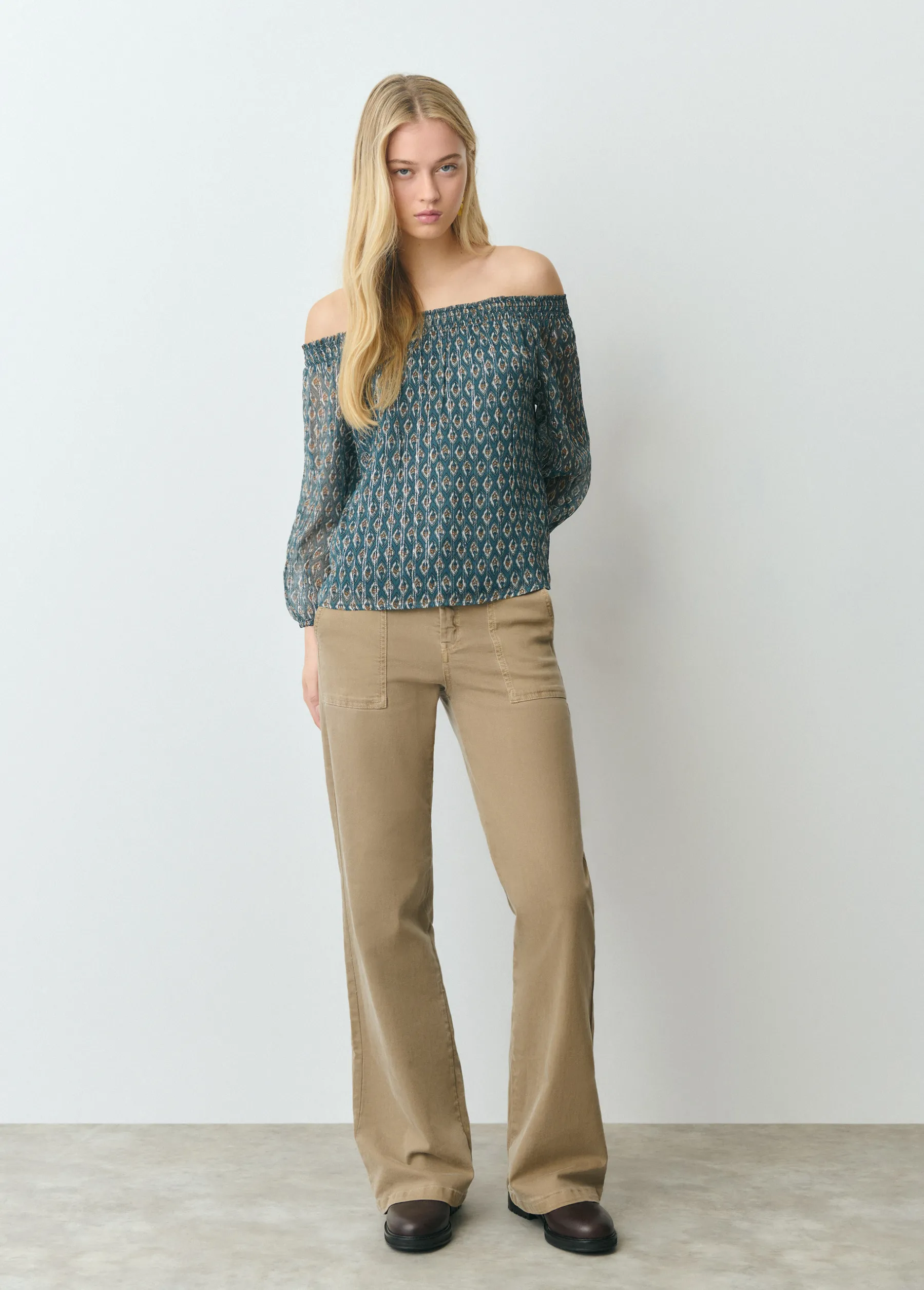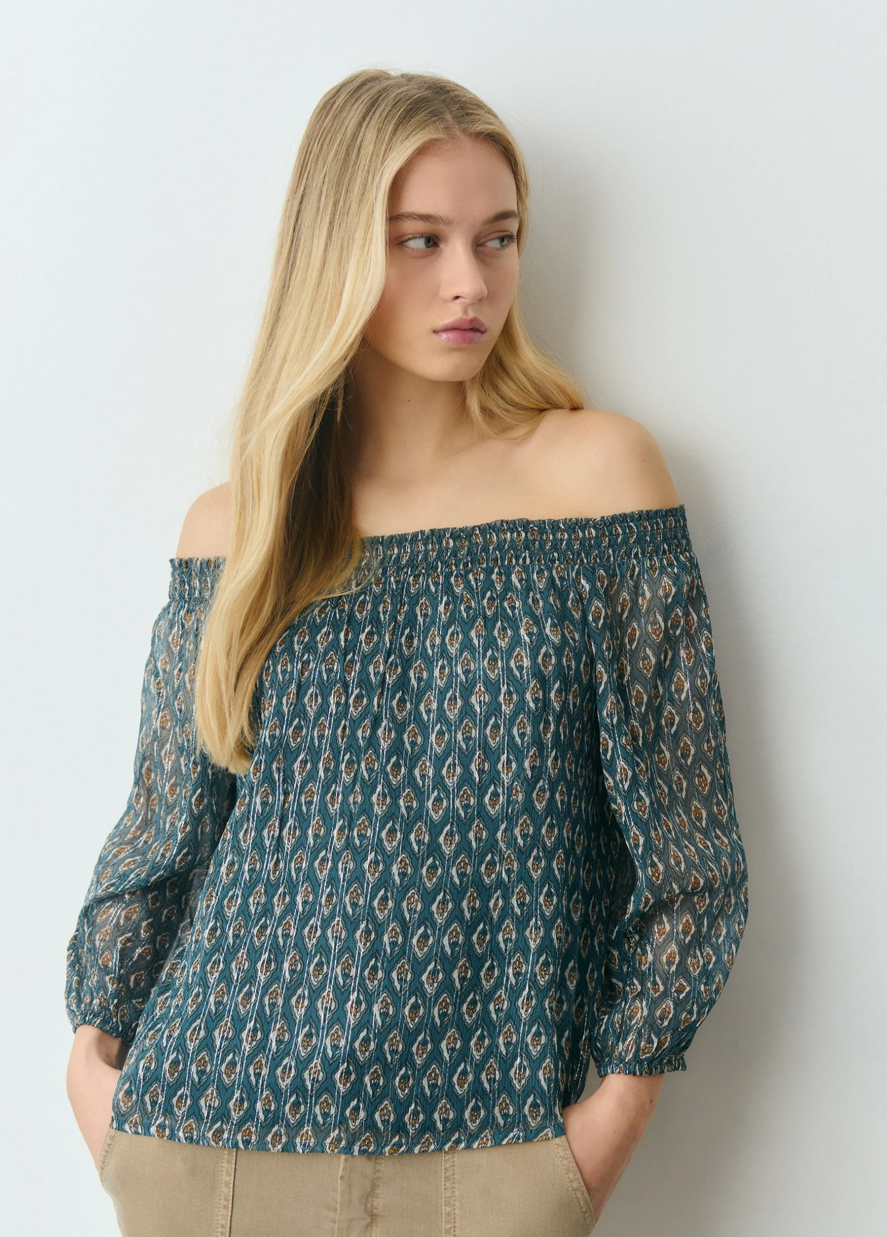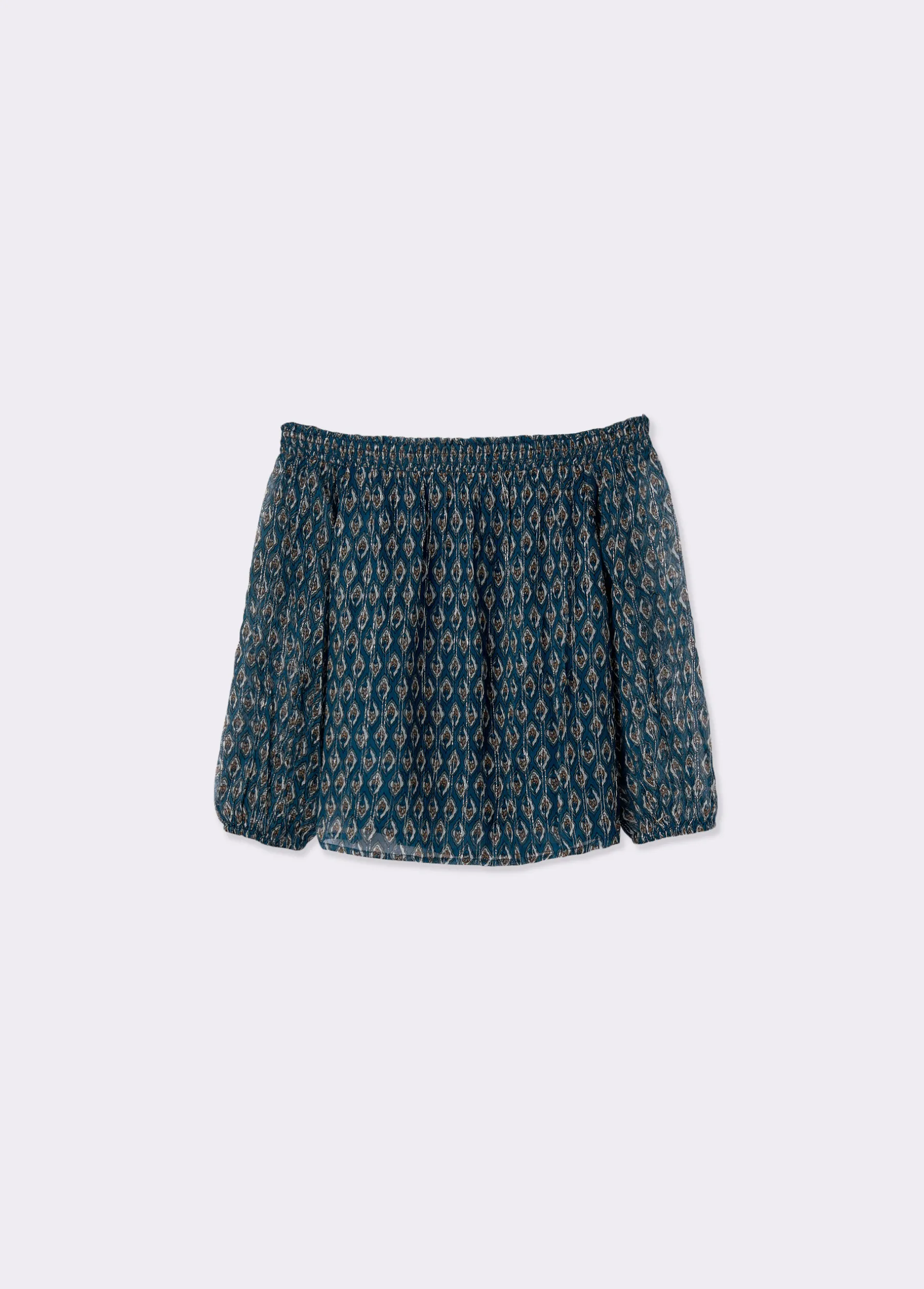 Blusa estampada de manga francesa abullonada y cuello de barco con smock.
