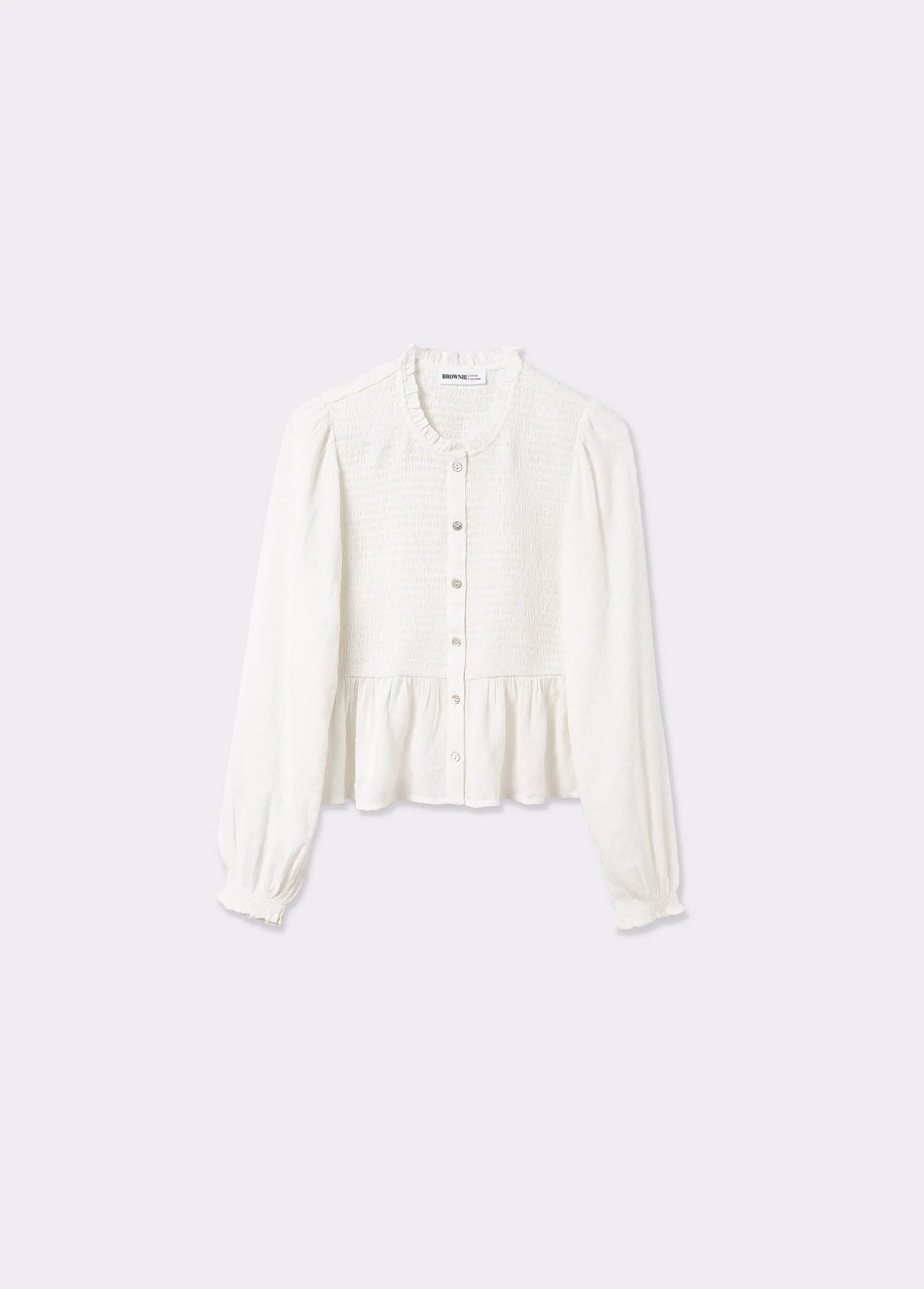 Blusa de manga larga abullonada y cuello redondo con smock. Cierre mediante botones en el frontal.