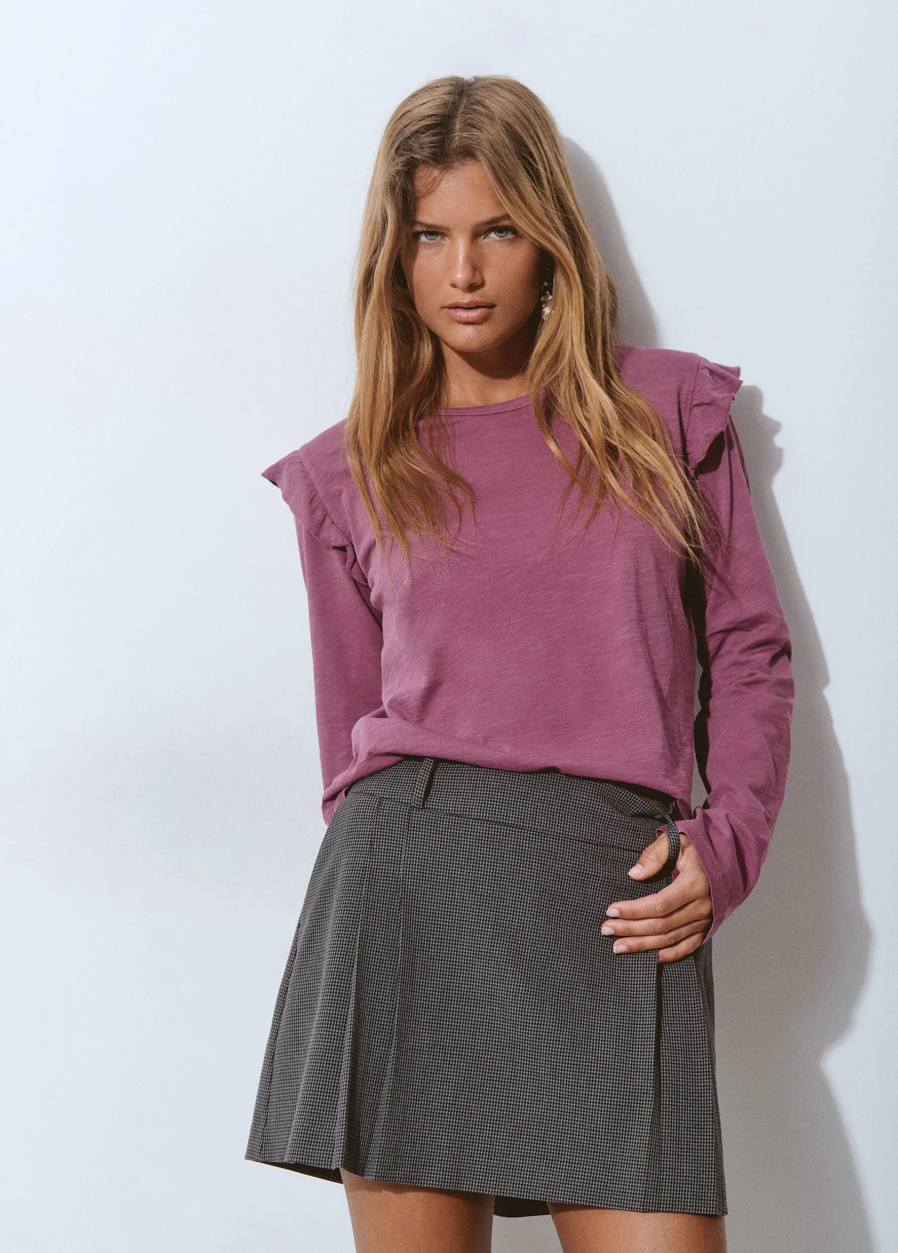 Camiseta de manga larga, cuello redondo y detalle de volantes.