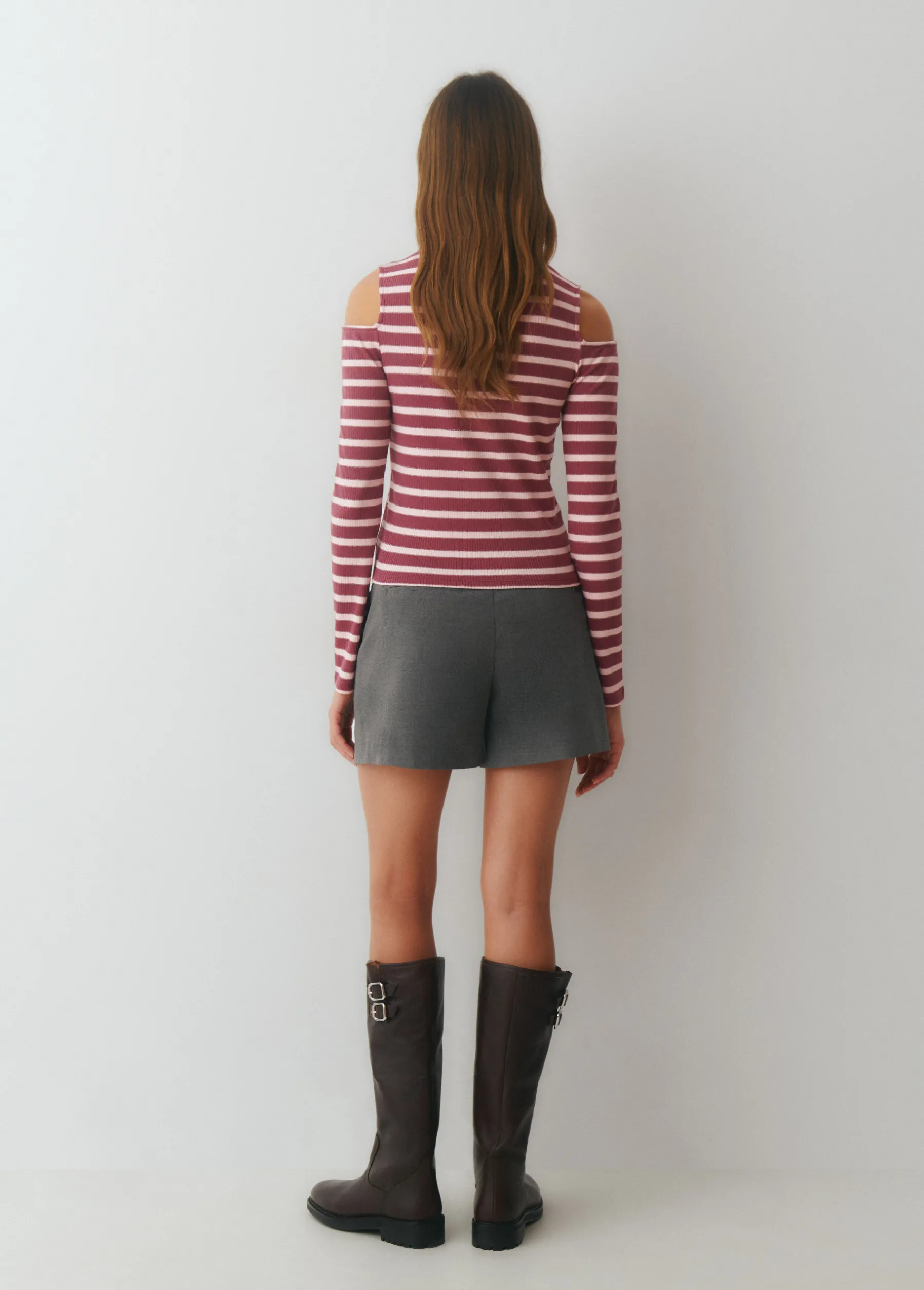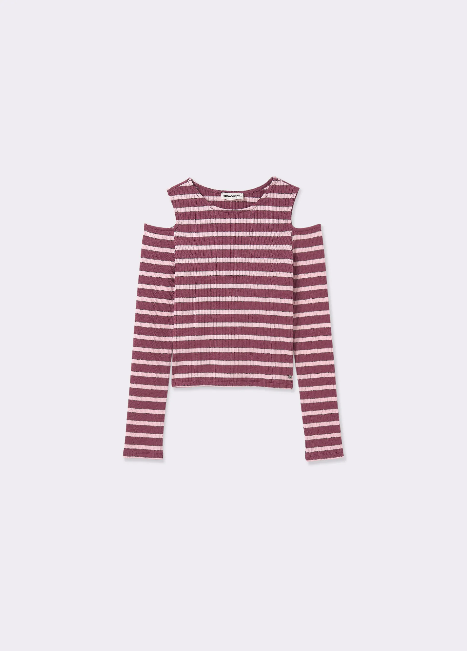 Camiseta de rayas de manga larga, cuello redondo y detalle de hombros descubiertos con lurex.