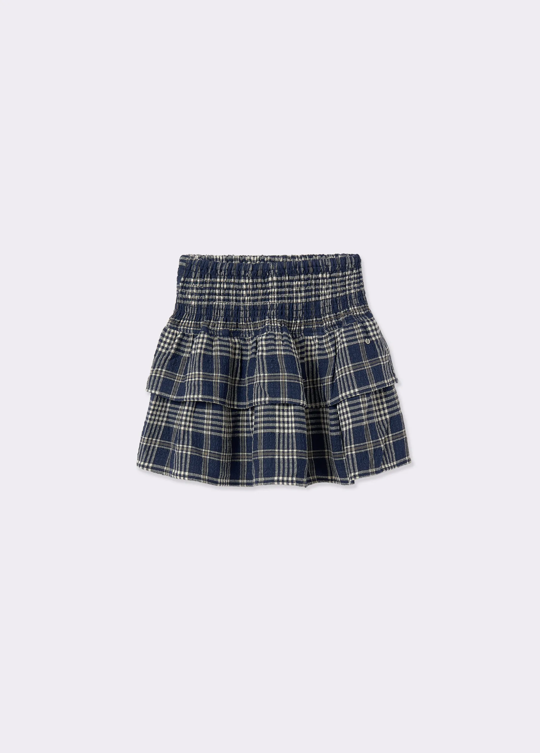 Falda pantalón corta de cuadros con smock y volantes en la parte inferior.