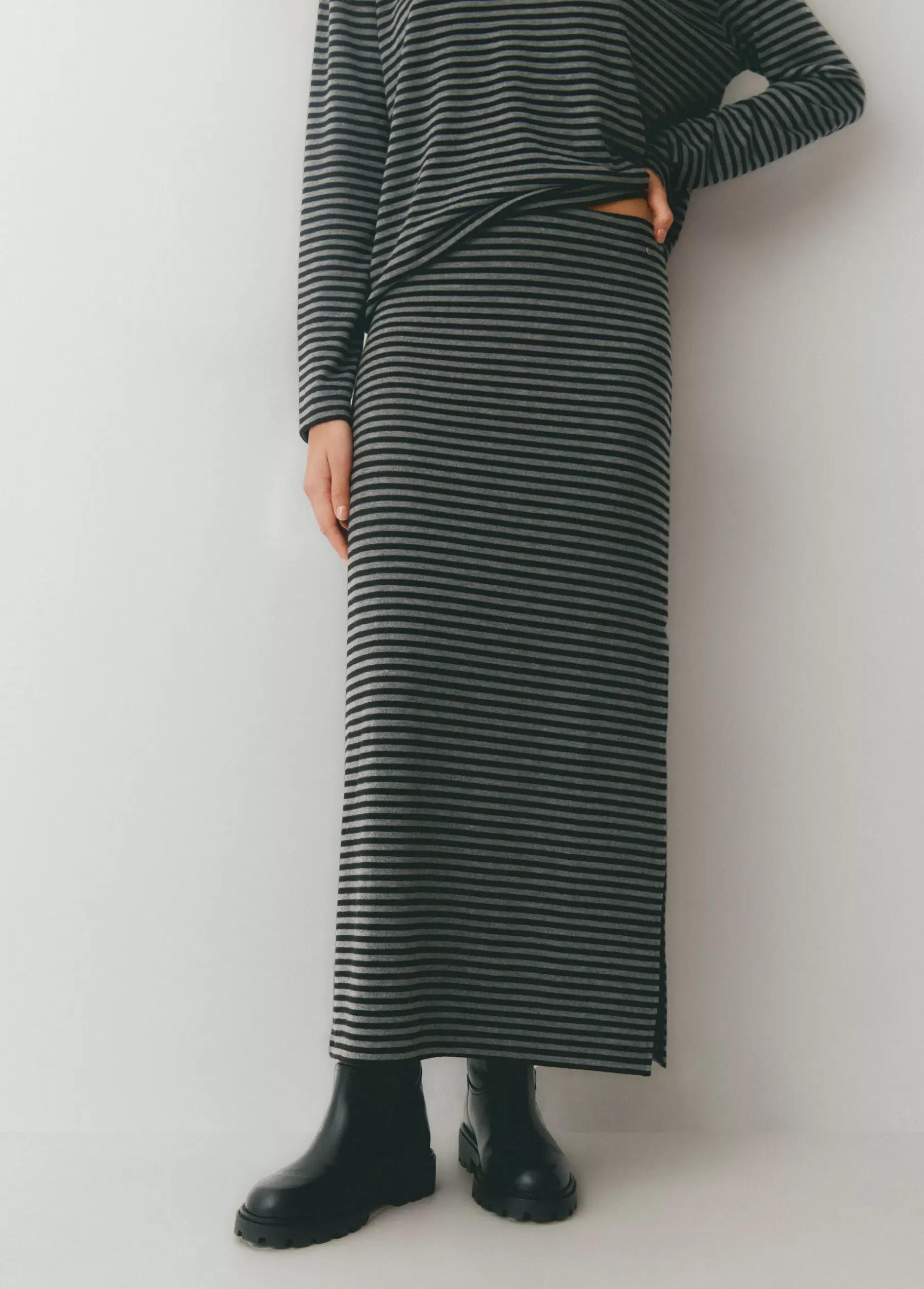 Falda midi de rayas con detalle de apertura en el lateral.