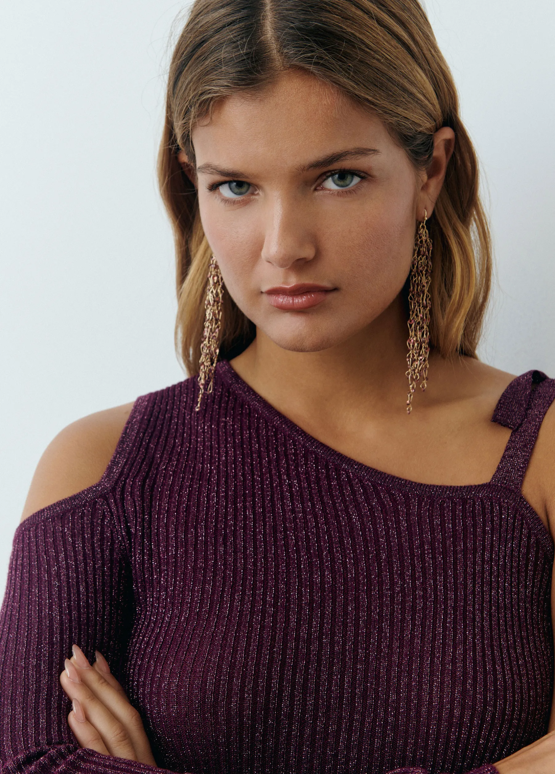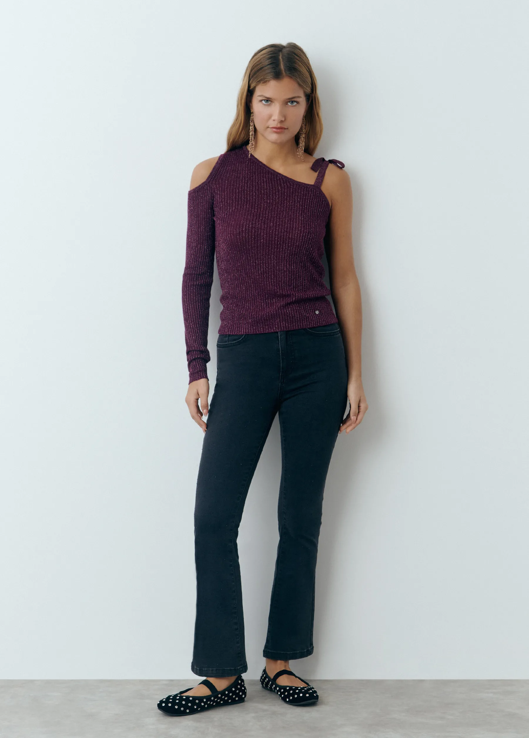 Jersey liso asimétrico con una manga, detalle de cut-out en el hombro y lazada.