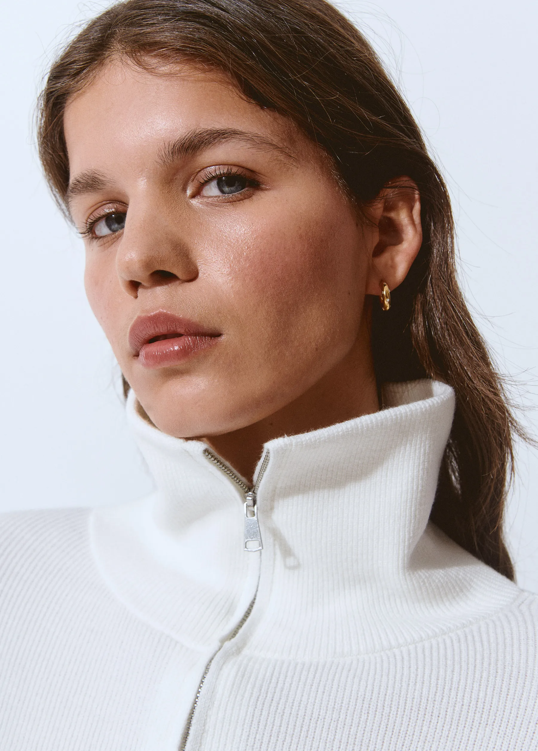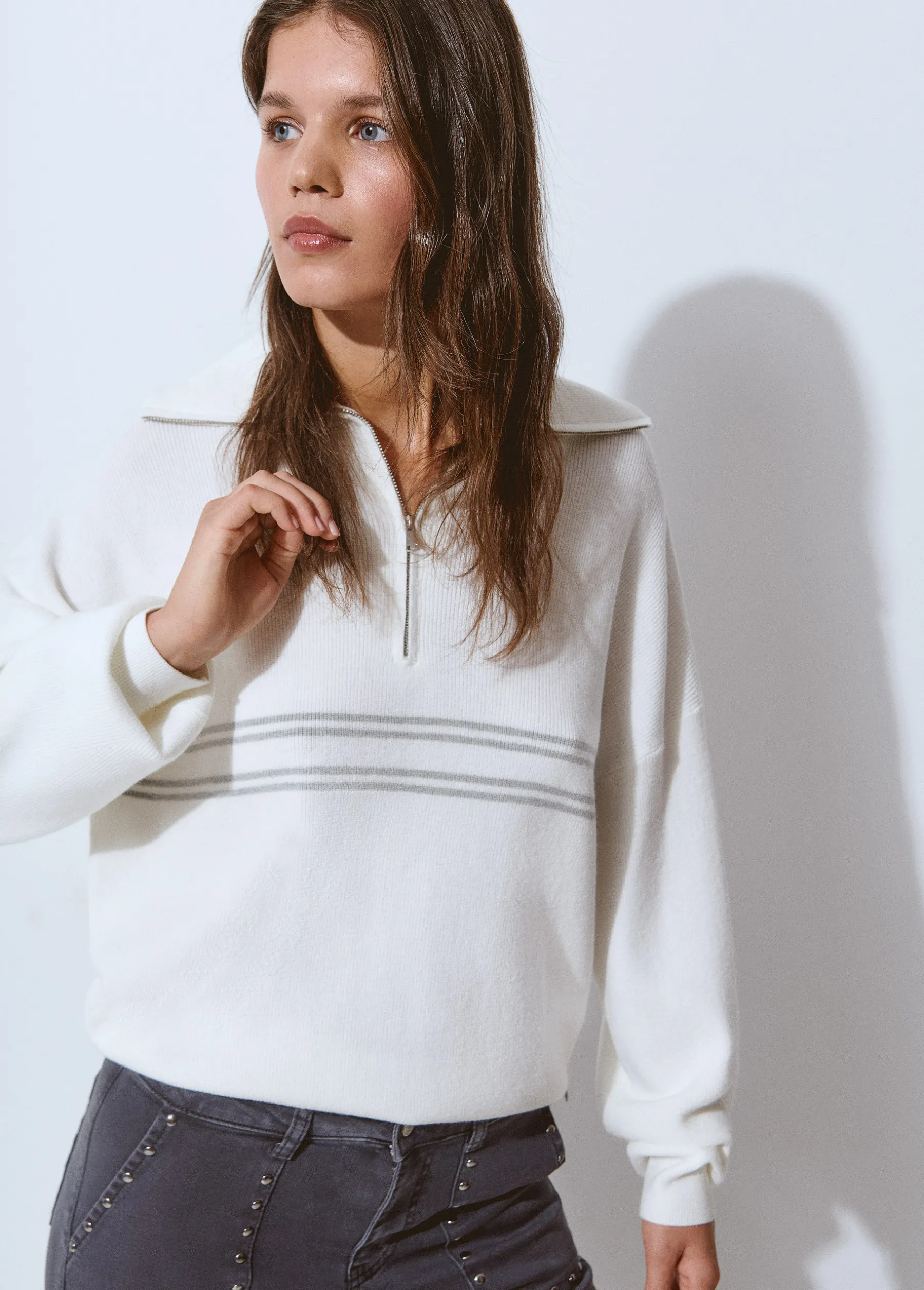Jersey de manga larga, cuello con solapas y cremallera y detalle de rayas.