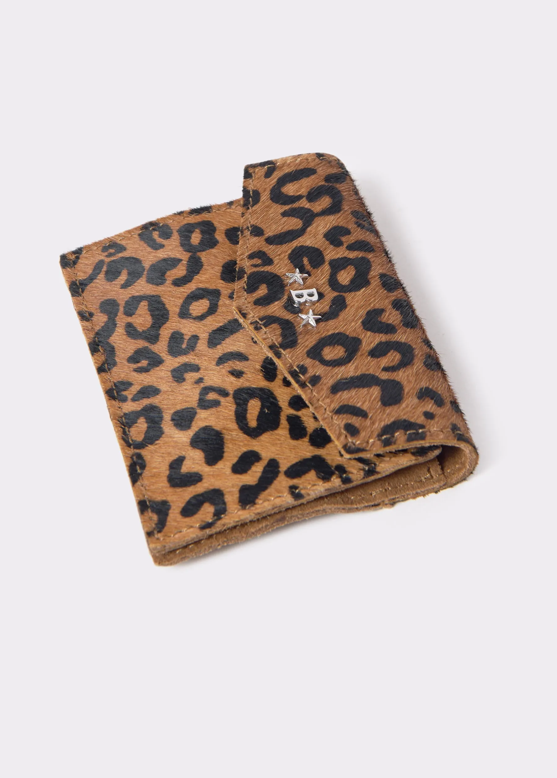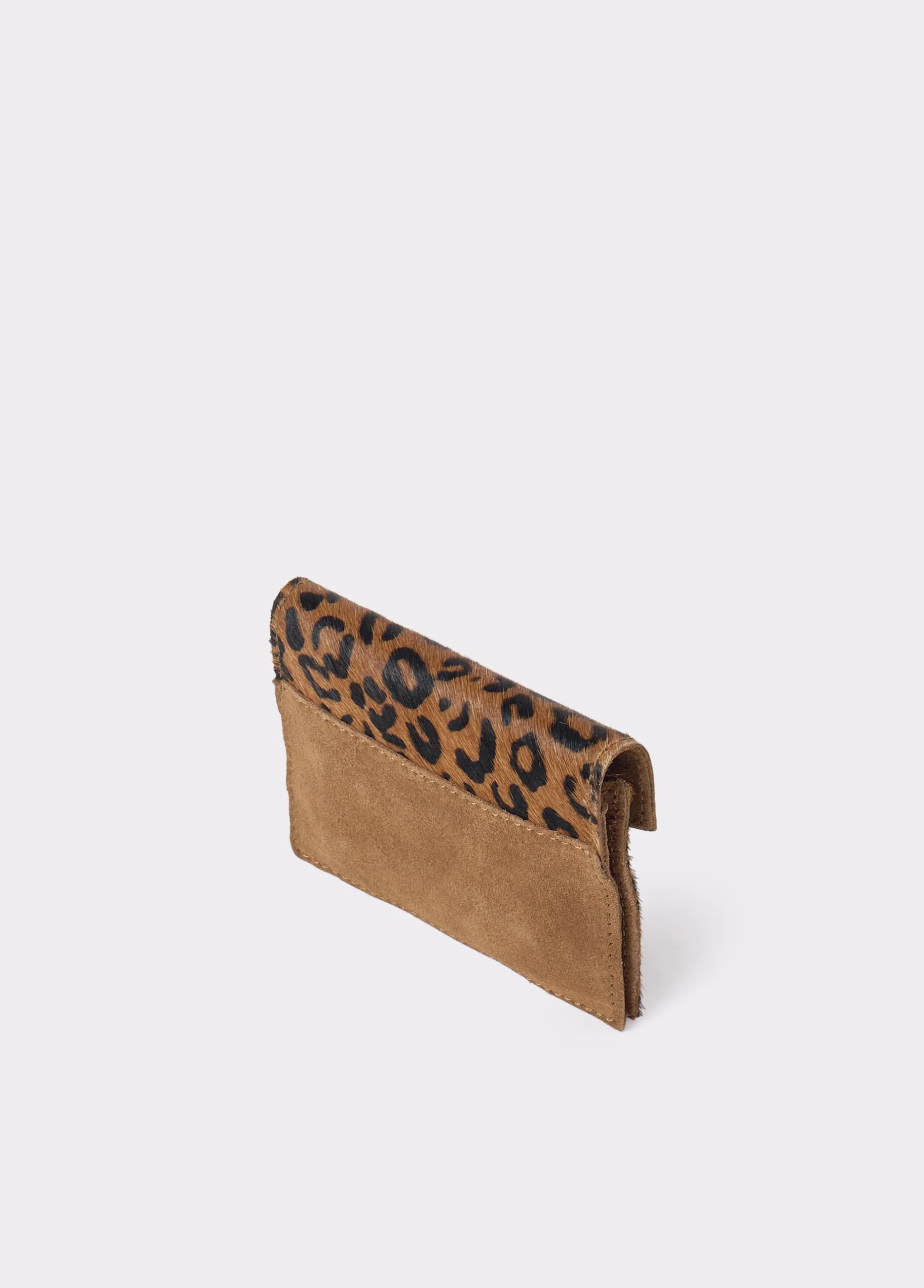 Tarjetero de piel estampado animal print tipo sobre con imán en la apertura y cremallera en el interior para guardar monedas.