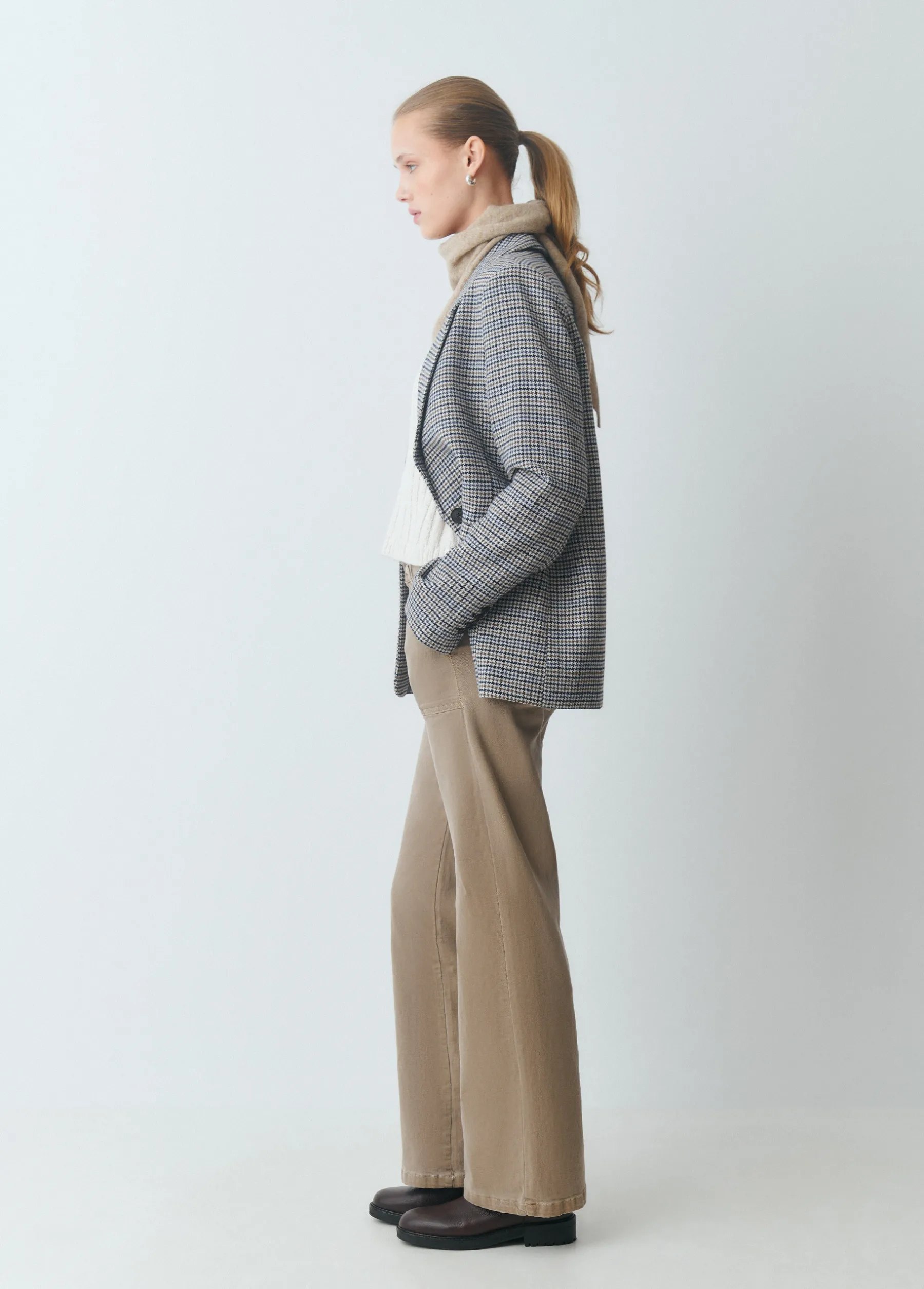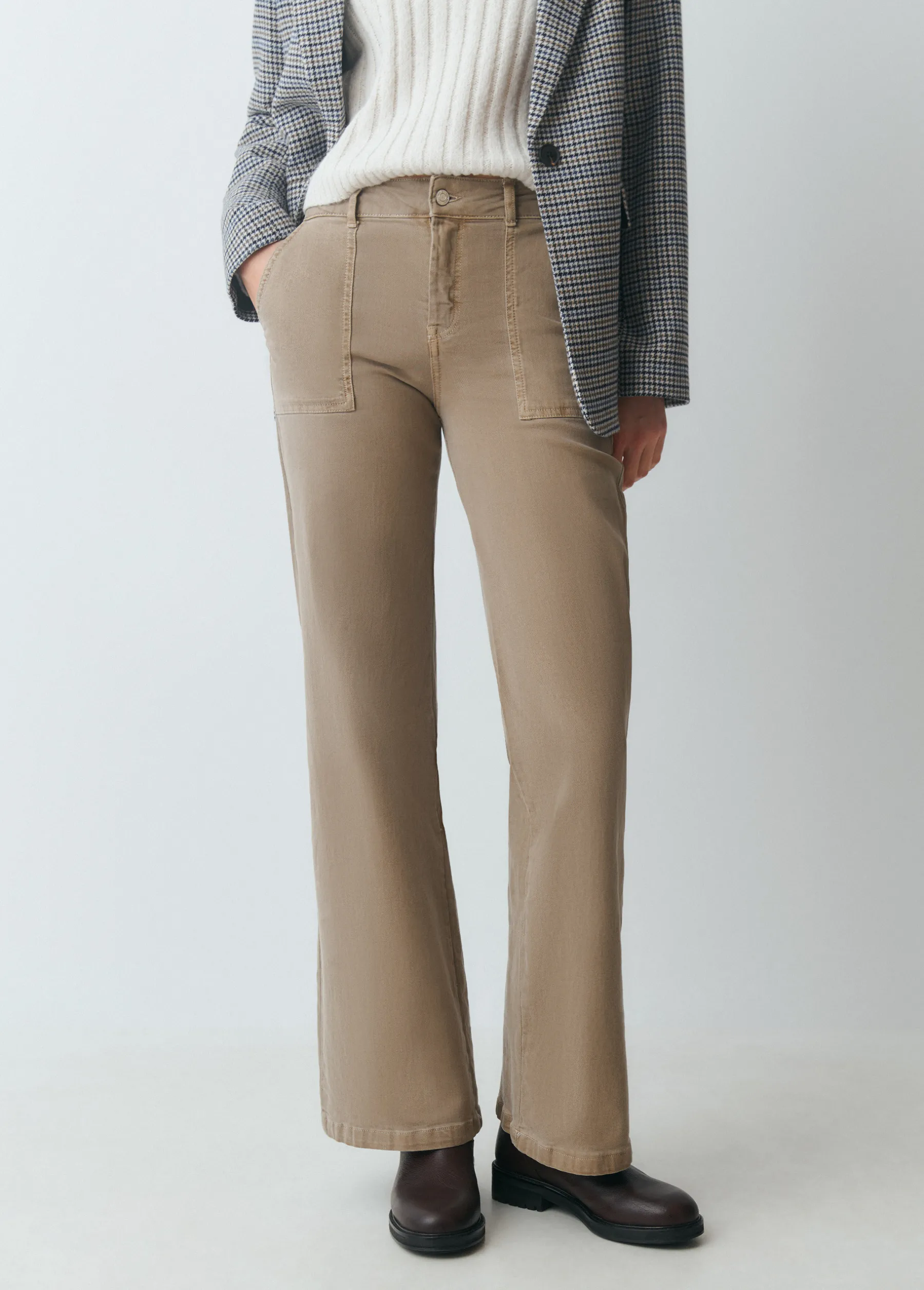 Pantalón culotte tiro medio con maxi bolsillos en la parte frontal. Cierre mediante cremallera y botón.