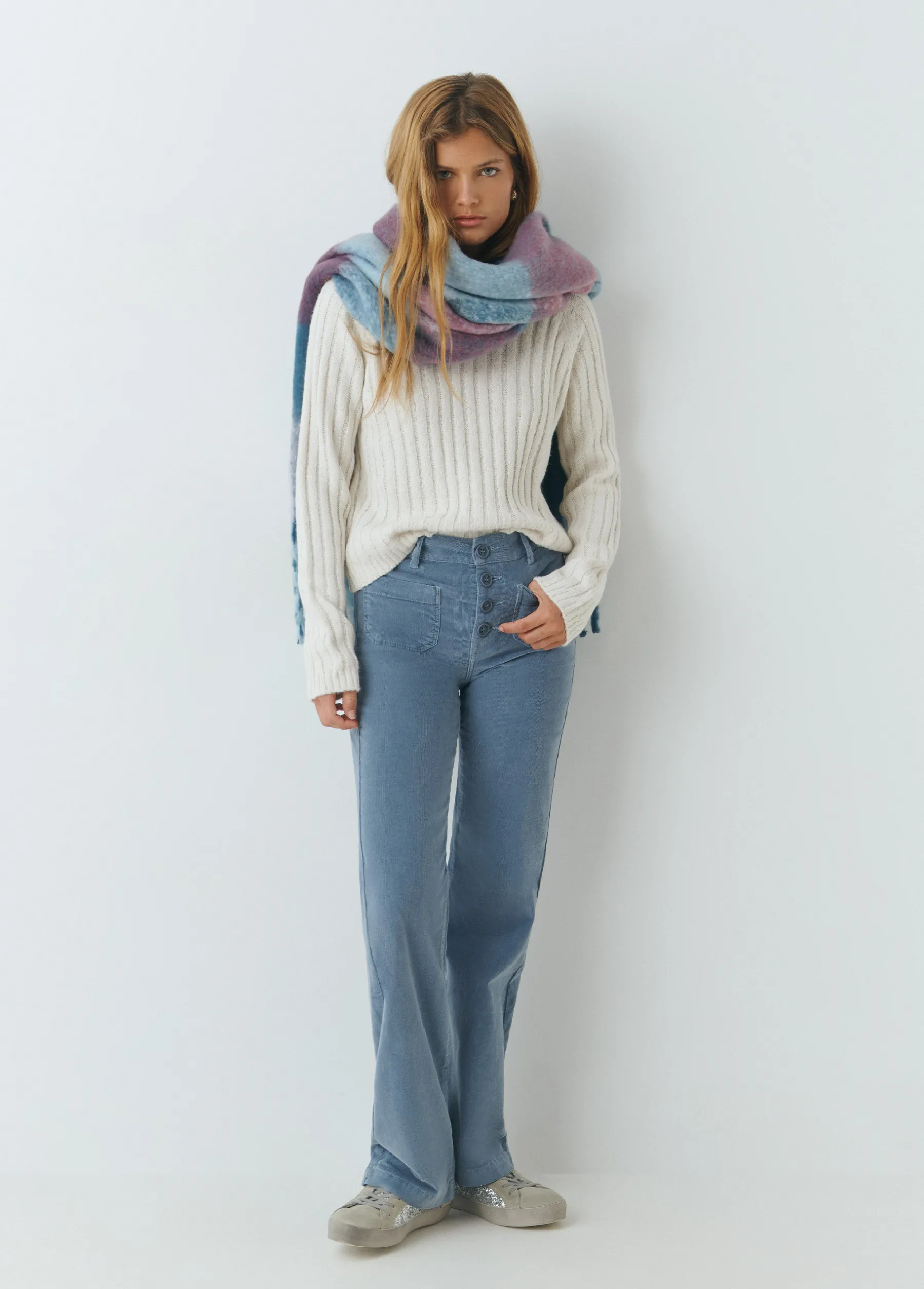 Pantalón culotte de pana con bolsillos frontales. Cierre mediante botones en la parte frontal.