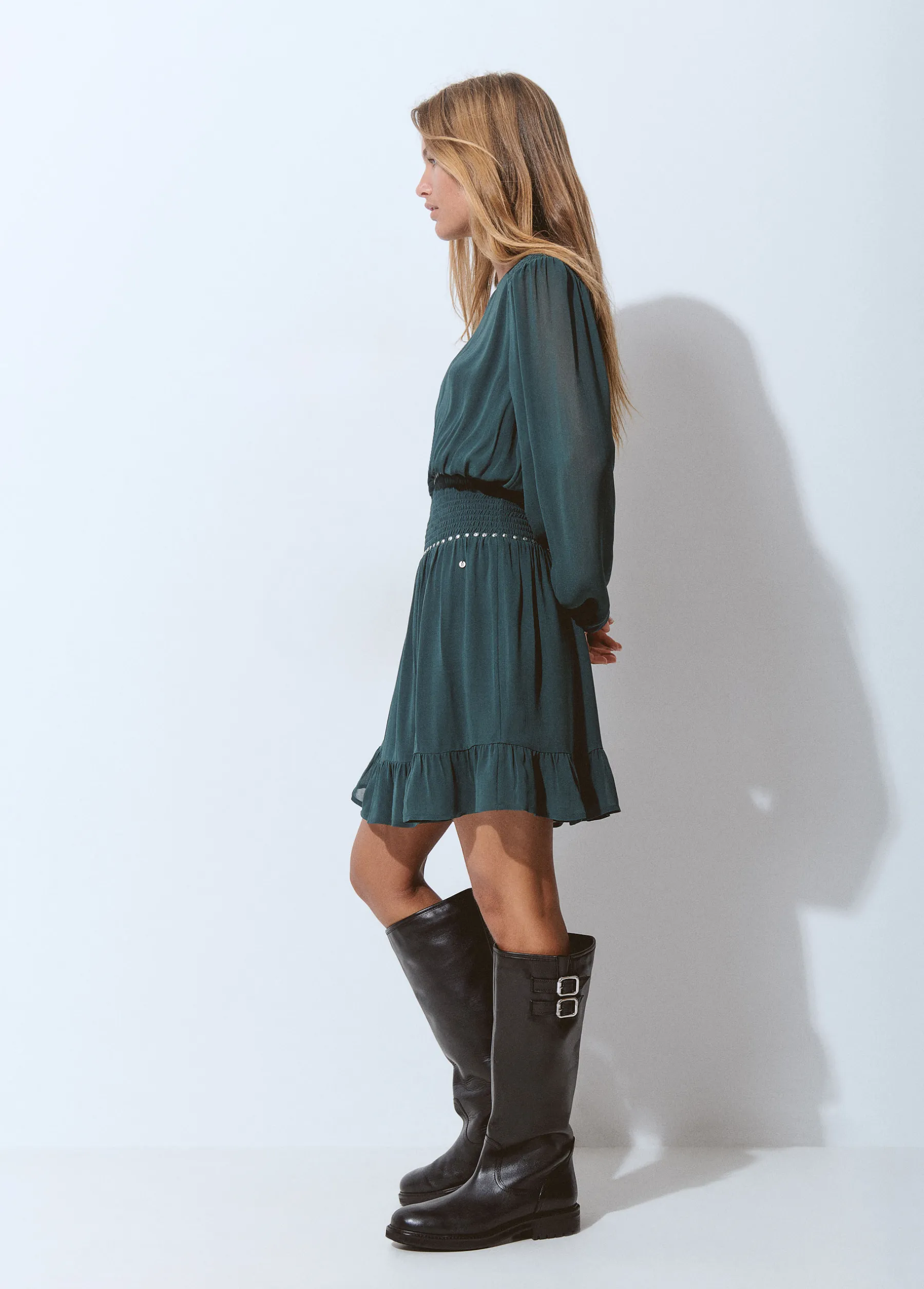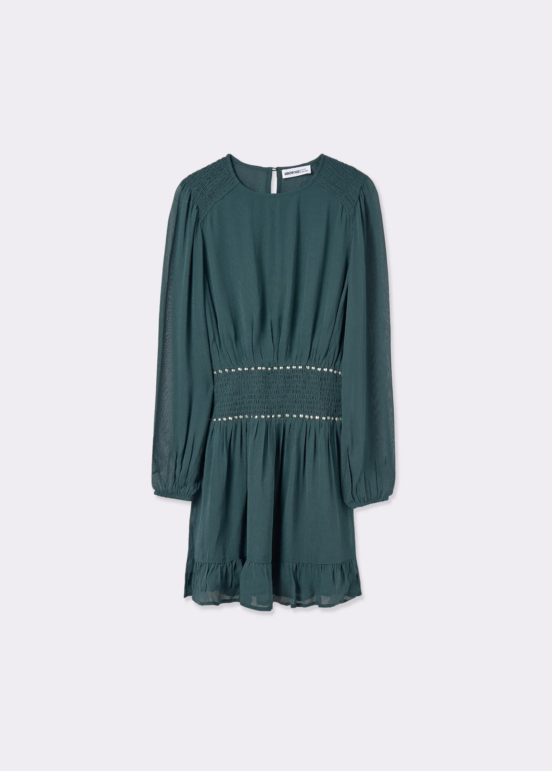 Vestido de manga larga, cuello redondo y cintura con smock y detalle de tachas.