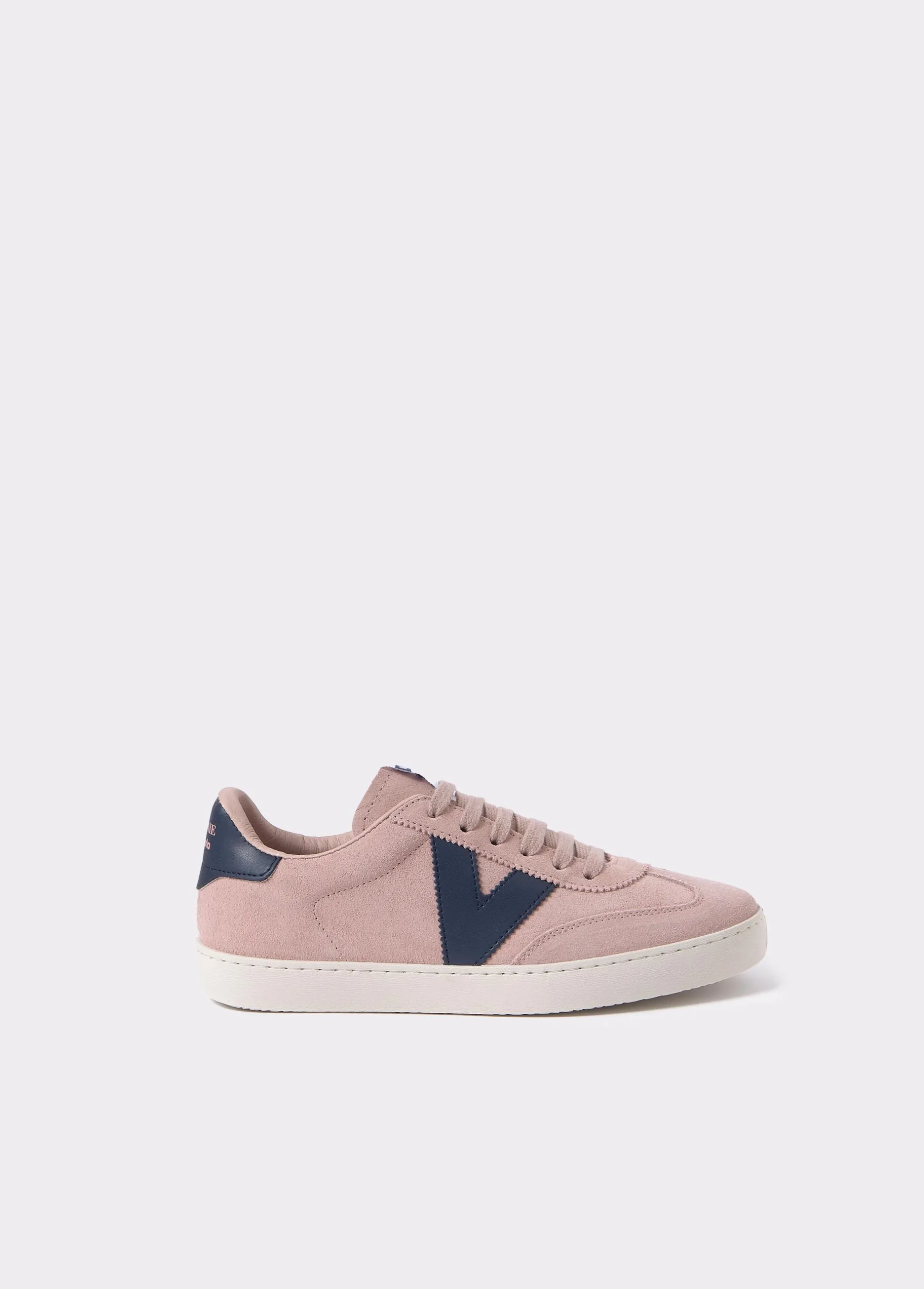 Bamba rosa de piel en colaboración con Victoria con detalles en color azul en los laterales y en la parte trasera.