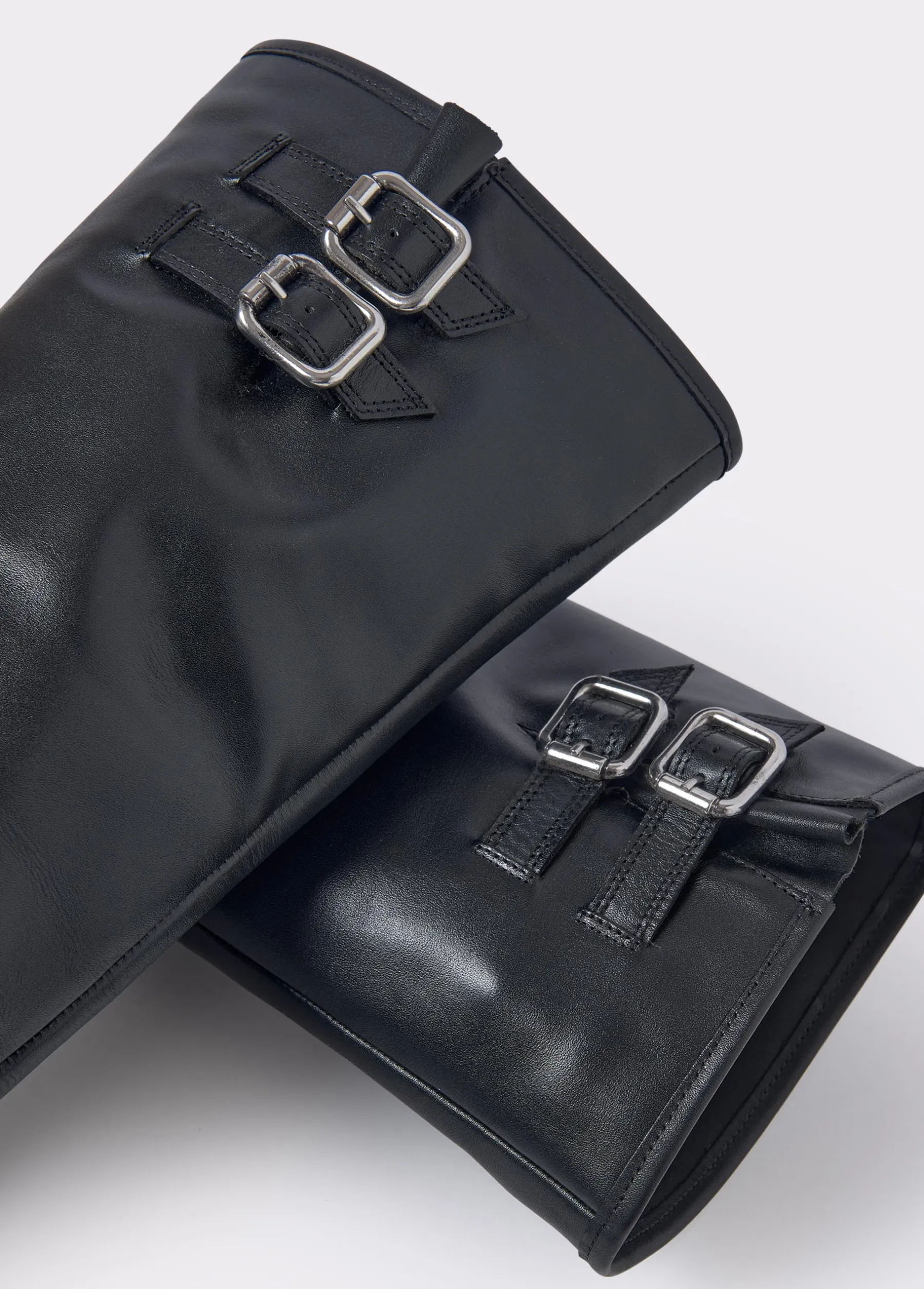 Bota de piel de caña alta en color negro con detalle de hebillas plateadas en la parte superior.