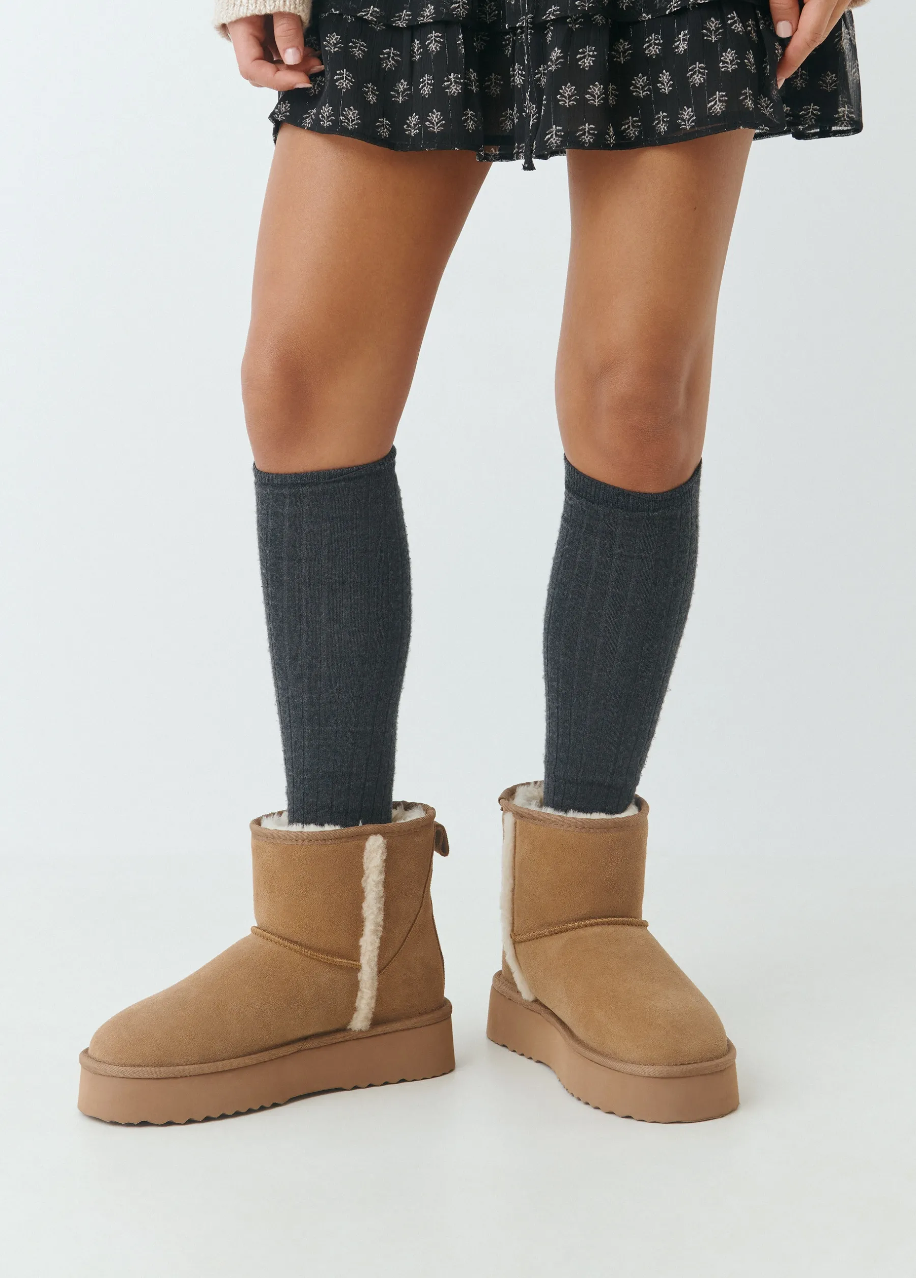 Botín de piel con pelo y plataforma en color avellana.